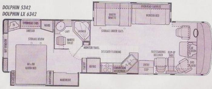 | 2004 Dolphin LX, 6342 23,000 miles, 8.1 Chevy Workhorse, Allison Trans, Onan Marquis Gen, 22.5 wheels, 2 Slides-TV's, 2 ton basement A/C Heat pump, 35,000 BTU electronic ignition furnace, leveling jacks, rear camera, Home theater Entertainment package, Sat radio W/Tape/CD/10 CD remote changer, 12 cu. ft side by side refer w/ice maker, Air Lift Air Ride installed, 4 Elite awnings, Electric sunvisors, 6-way electric drivers seat, variable speed Fantastic Fan w/rain sensor/thermostat, Corian countertops, Ceramic Tile/Carpet throughout, Stainless Steel appliances, non-smoker, no pets. |