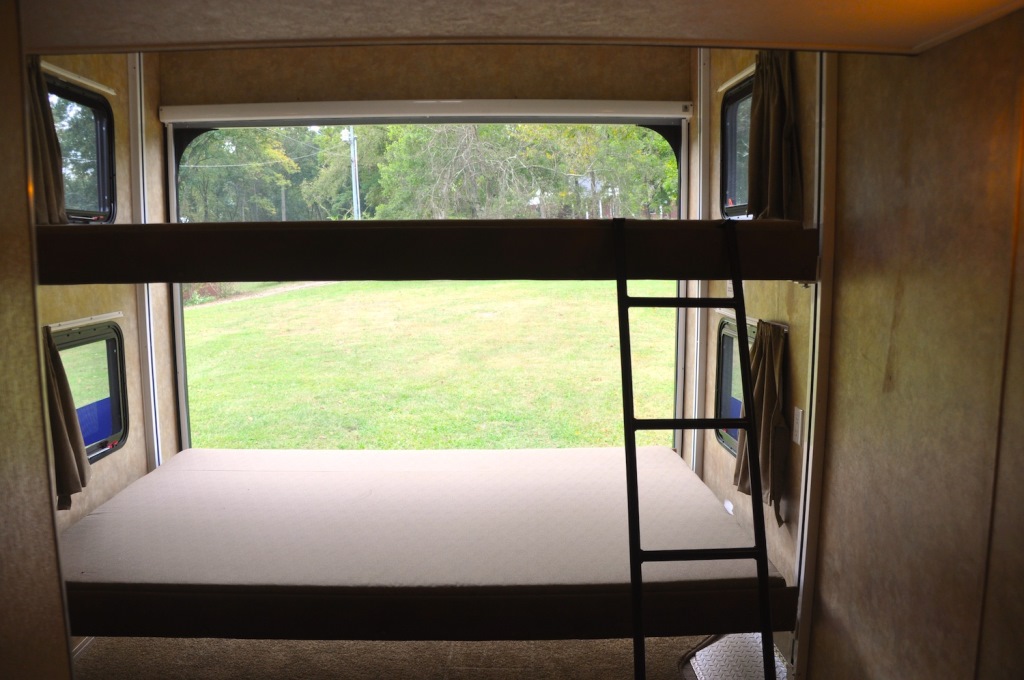 Inside- 35' long (from hitch to back) sleeps 10 adults 15000 BTU AC/Heat full bath hot water heater convection microwave double stainless steel sink 1 slide out back 2 beds are queen size motorized bunk beds loft bed is queen size with ladder slide out couch folds out to a full size bed front u-shaped dinette converts to king size bed flat screen tv, (satellite, cable, or antenna ready) combo cd/dvd Sony Xplode stereo with sub wolfer and inside / outside speakers 3 tv/satellite hookups gas cooktop with 2 burners refrigerator (can run on propane or electric) and freezer 12' garage area in back with tie downs, removable carpet and pull down screen for rear door Outside - outside shower lights powered awning that retracts automatically in high winds or heavy rain built in 4KW ONAN generator stabilizer jacks Aluminum rims full cover extra 50ft of power cable |