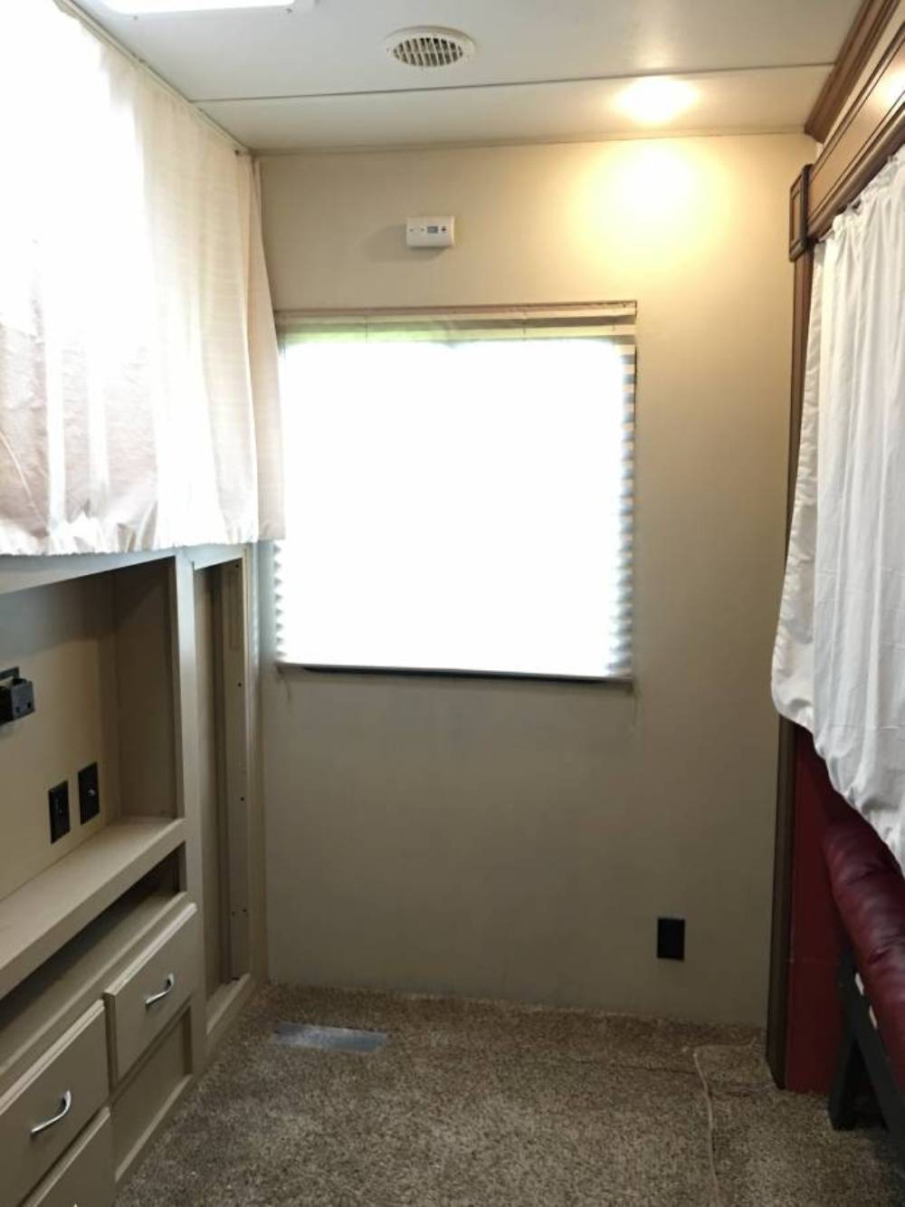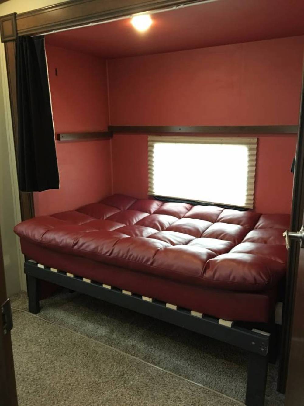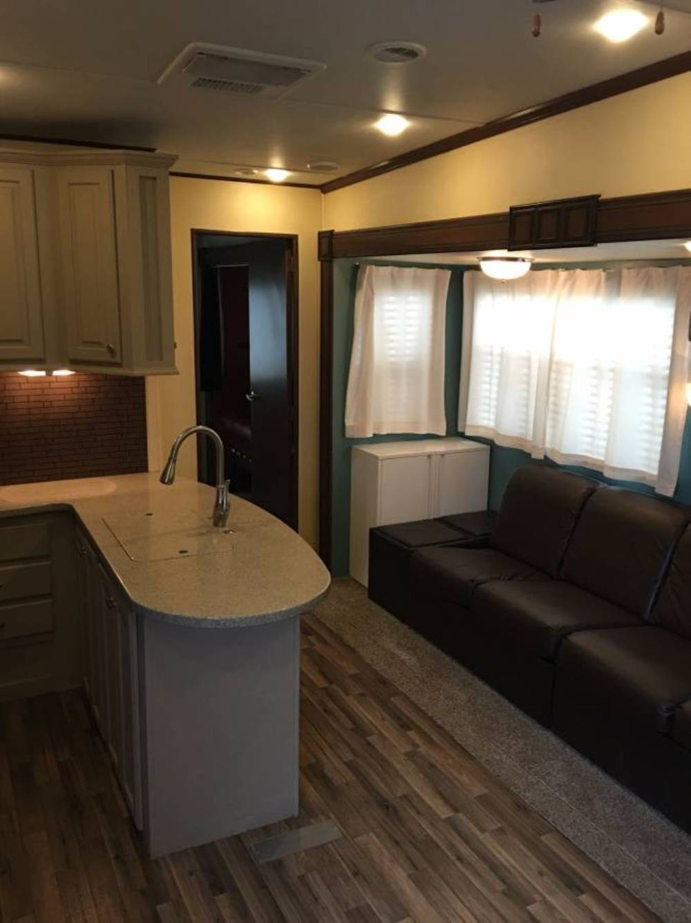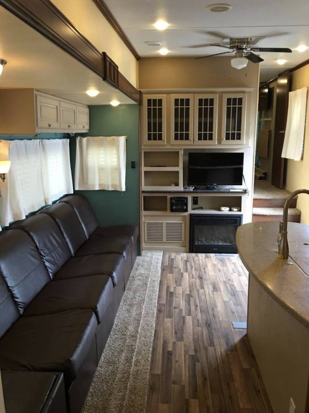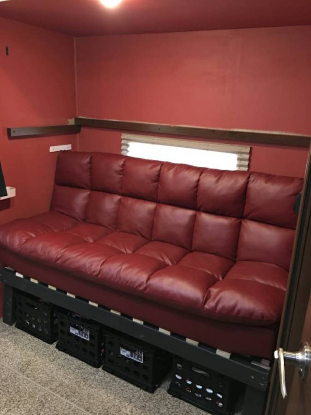 The dinette and love seat were replaced with a 5 seater home reserve couch with hidden storage under each seat and 2 storage ottomans. |