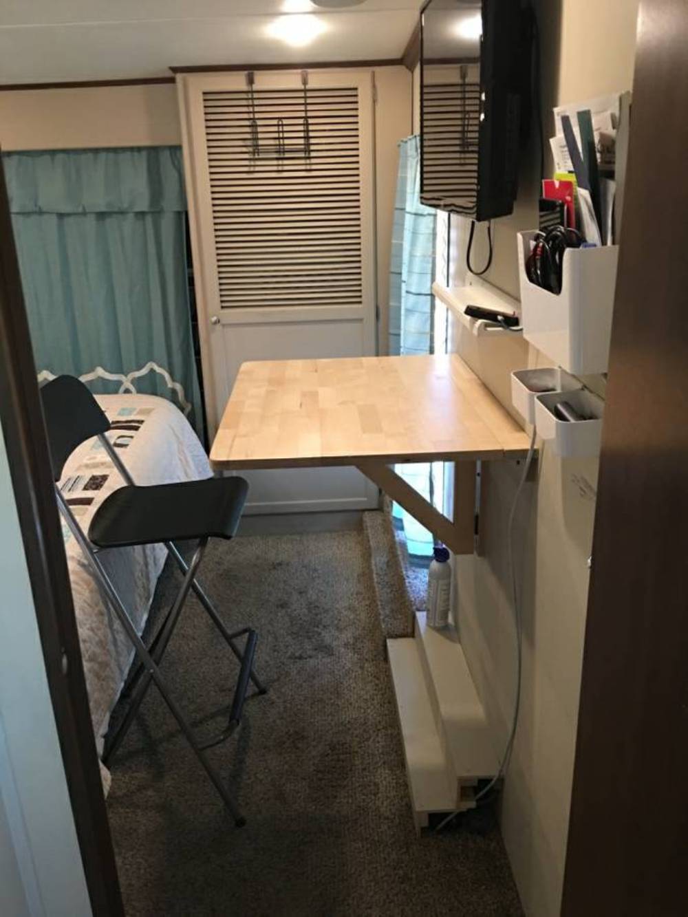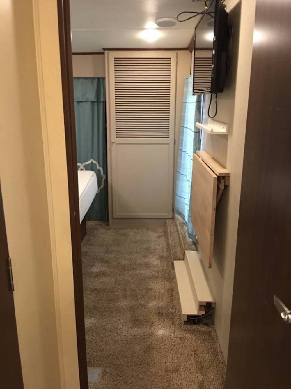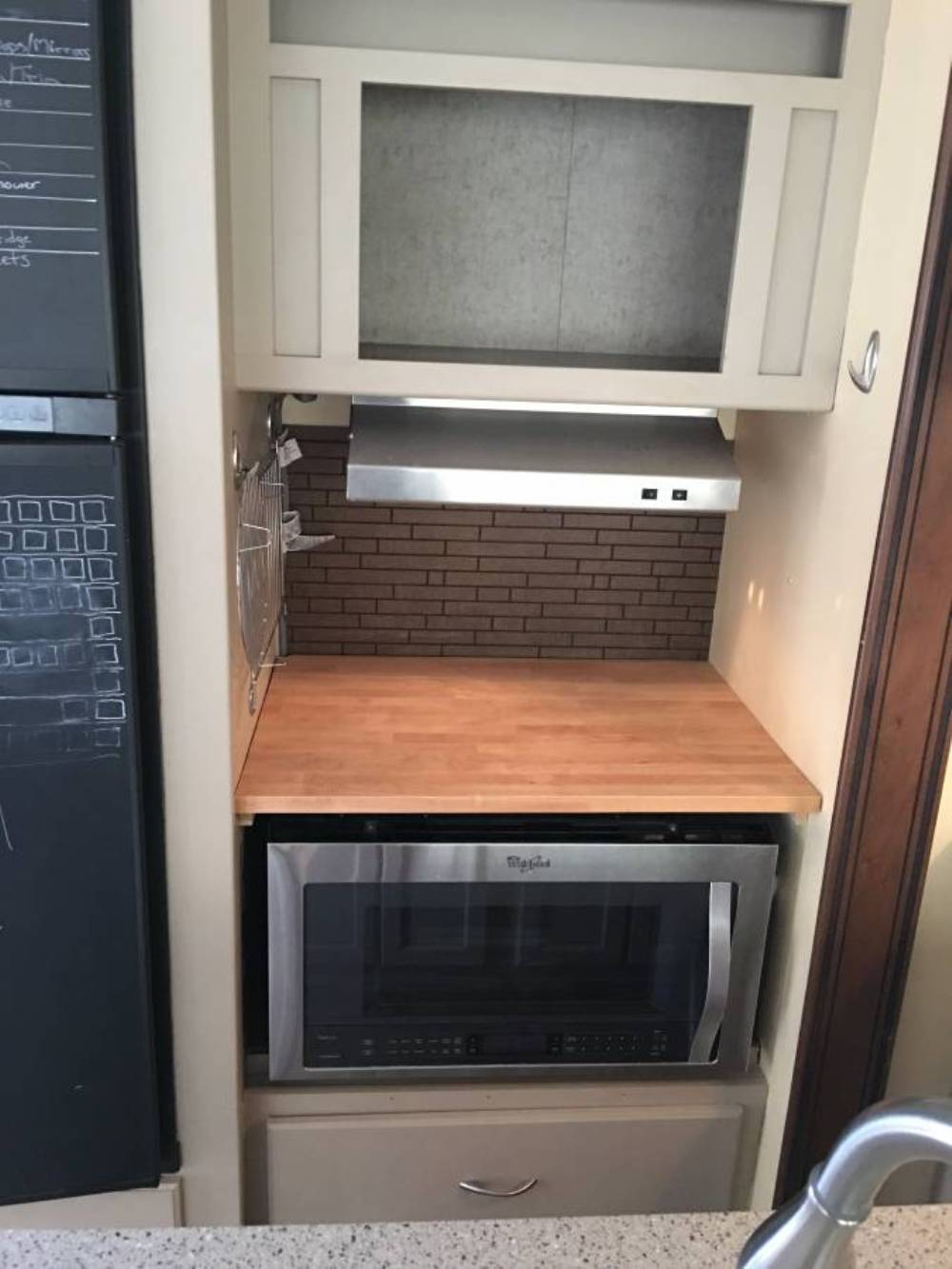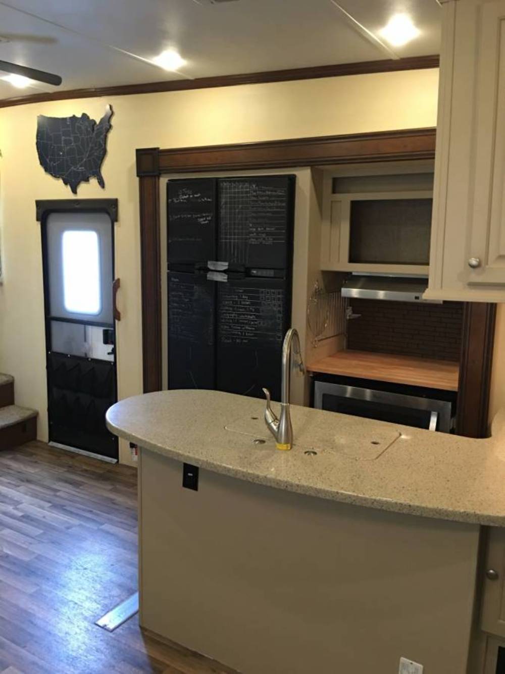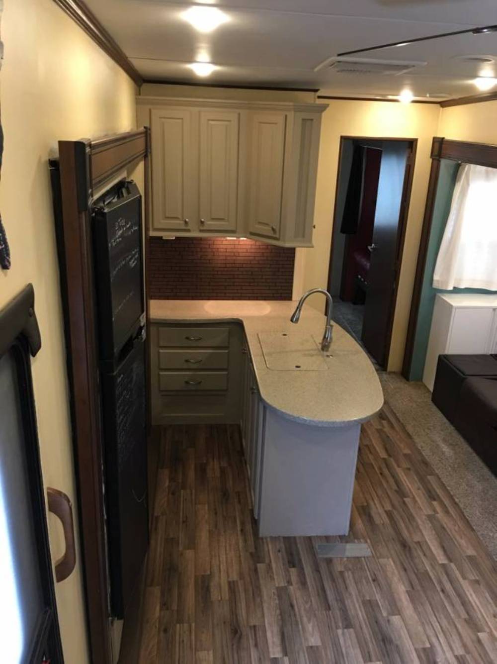 The dinette and love seat were replaced with a 5 seater home reserve couch with hidden storage under each seat and 2 storage ottomans. |