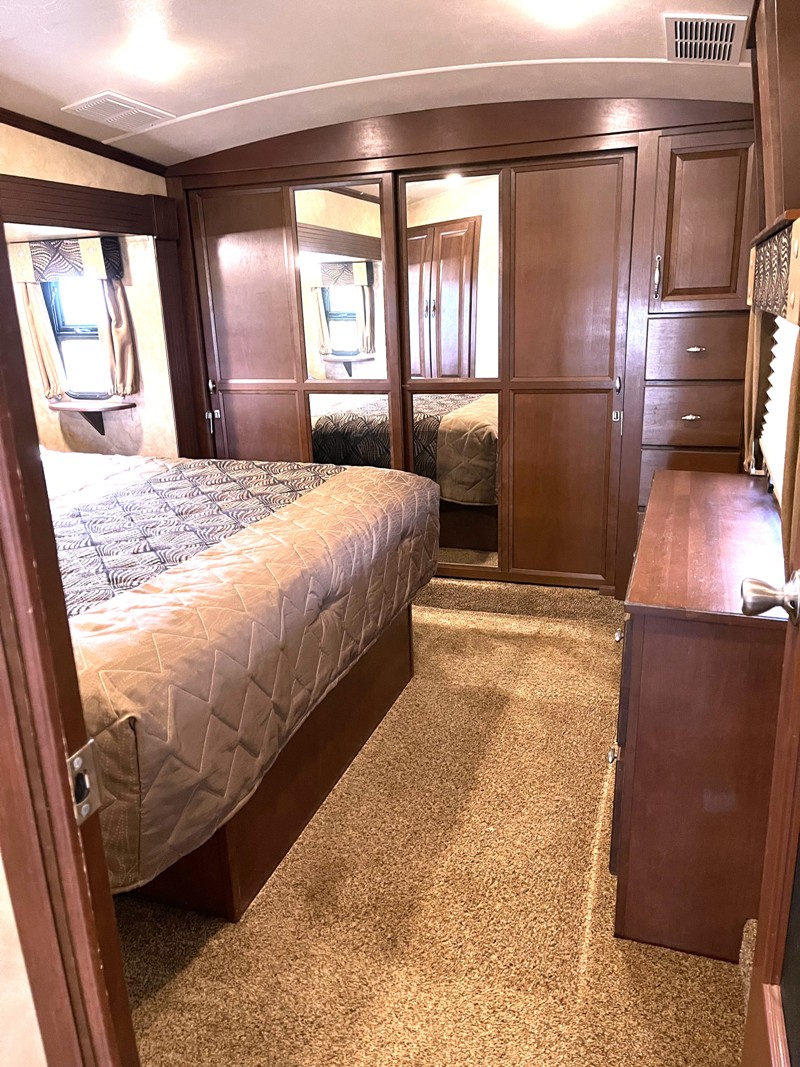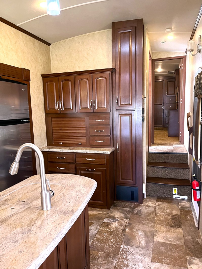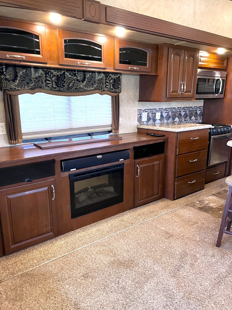 No Pets, Pulled Less Than 500 Miles. Vinyl Floors, Carpet, Cherry Wood Cabinet, Corian Counter Tops, Full Kitchen w/Island, Top/Bottom Fridge, Separate Ice Maker, Conv. Microwave, Stove Top, Dining Table & 4 Chairs, Shower w/ tub, Skylight, 2 TVs, DVD, CD/Cassette, Sound System, Monitor Panel, Day/Night Shades, Washer, Dryer, Fireplace, Central Vac, Fantastic Fan, Sleeps 4: King Island Bed, Sofa Sleeper, 2 Leather Recliners. |