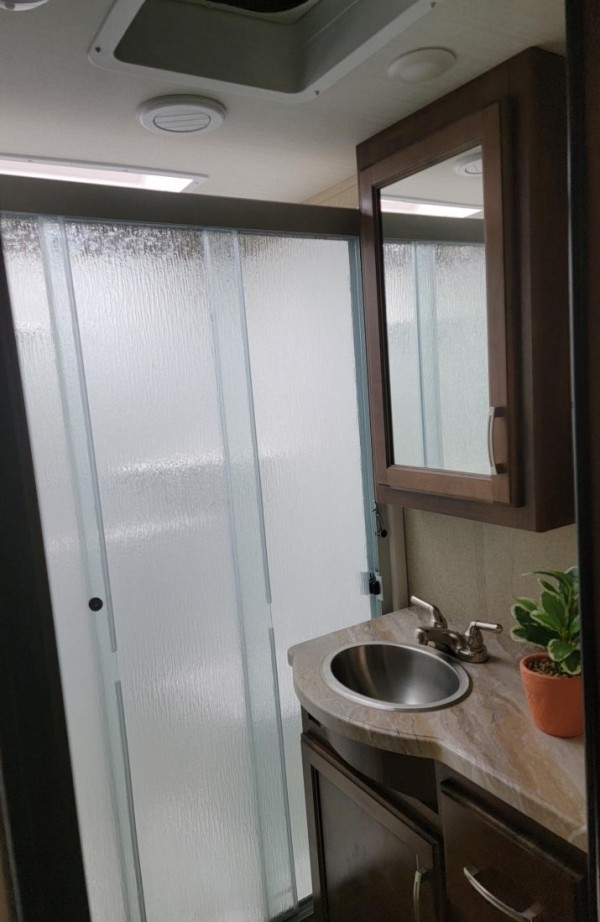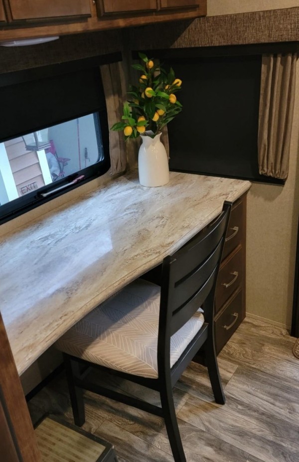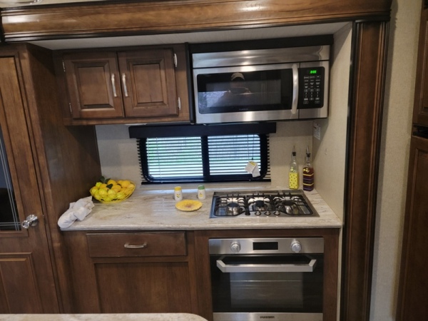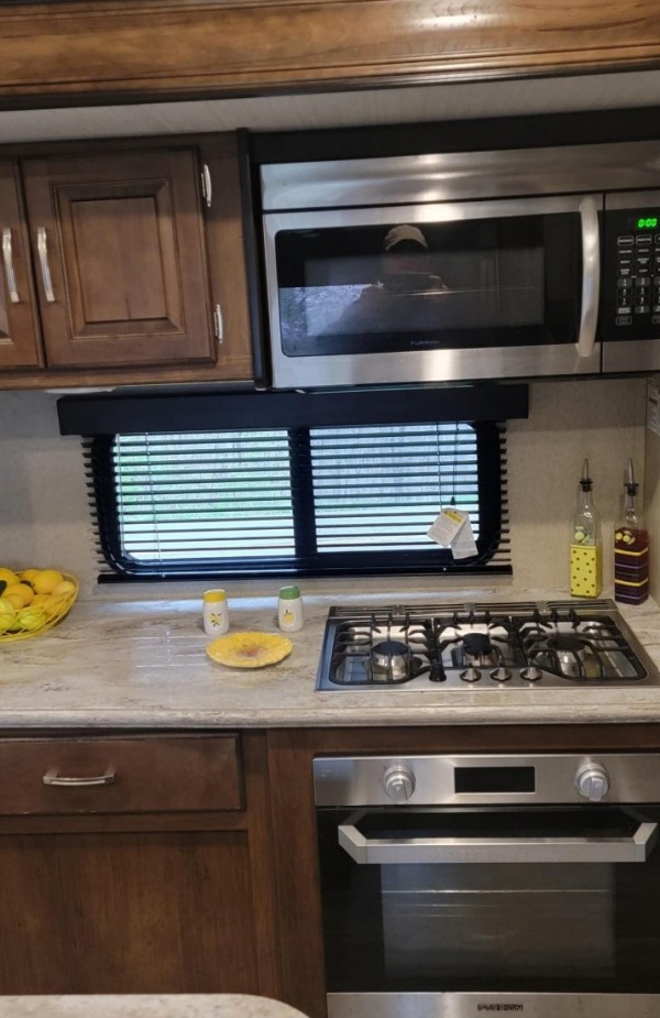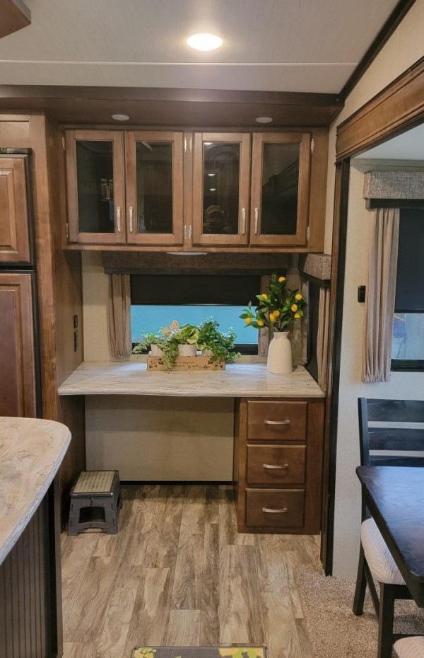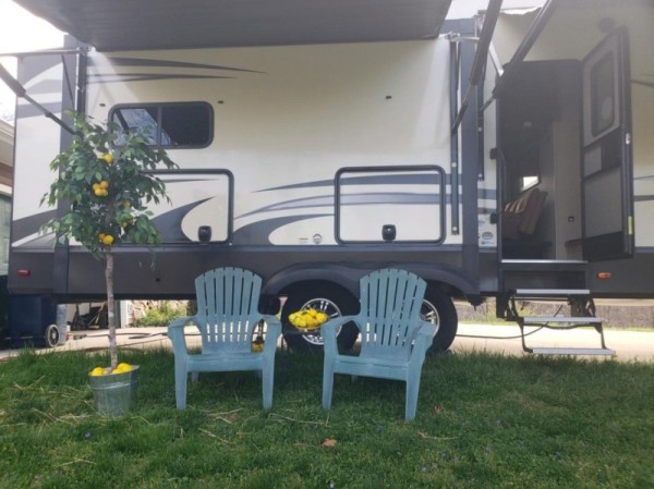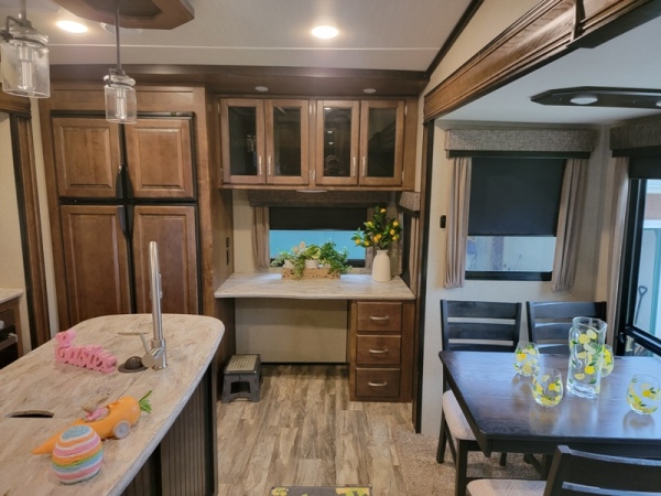 is perfect for you! Need Tow Vehicle? Will sell 2019 F350 XLT Diesel with Fifth Wheel Hitch along with this Fifth Wheel for additional $68,000. Will not sell separately. Just imagine cooking on the outdoor kitchen under the second awning while visiting with other campers. If you have to work, the desk in the rear of the fifth wheel is quite convenient. Your spouse can cook in the gourmet kitchen inside with a center island and large sink while planning your afternoon adventures until you are finished working. You will find plenty of storage throughout for hanging clothes, blankets and such in the drawers or overhead cabinets, plus there is an exterior unobstructed pass-through compartment that allows you to store larger items. So if you enjoy playing while working, this model allows you to do both in the great outdoors! This Grand Design is easy to tow with aerodynamic front cap including Max Turn Radius to your favorite destinations. The Universal All-In-One docking station, LP Quick Connect, and One-Touch electric awning with LED lighting makes setting up and packing up easy for those weekenders or full-timers that like to move around. Inside, you will find the bedroom is complete with a queen bed, a king size wardrobe, oversized underbed storage, and much more! The Arctic 4-Seasons Protection package allows you to camp anywhere and anytime of the year. Tires replaced with Goodyears within the last two years. Loveseat replaced with Futon. Includes 120V Dryer and Small Freezer |