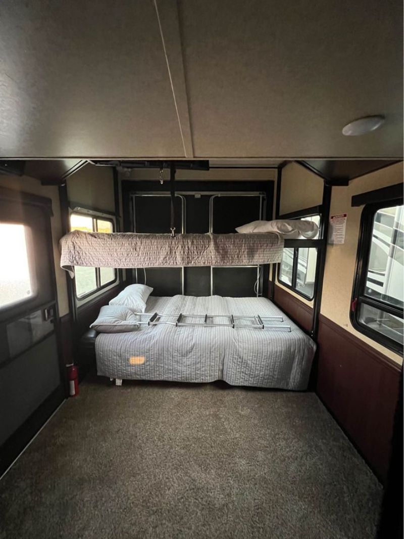 2015 HEARTLAND CYCLONE 4100 - 14,500 Pounds dry - 44’ long - 3/ AC units - 2 restrooms / 1 shower - sleeps 8 comfortably - 150 Gallons fresh water / 50 gallons fuel - auto level jacks - 12’ garage - 3 tables - Back ramp turns to patio with baby gates - Generator has 350 hours - Ton of storage - Residential fridge - Washer / Dryer hookup - Vinyl on couch needs replacement. - 1 Cal Queen / 2 bunk beds / 1 loft - Out door TV & Refrigerator - 3 awning around the rig - Fuel station - Fire place / Heater Combo |