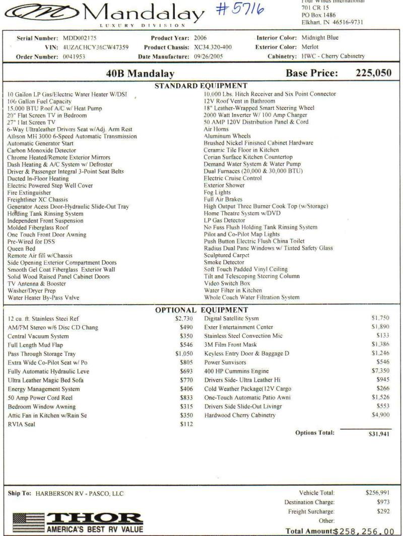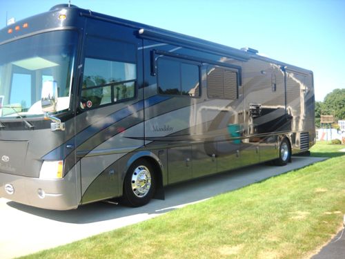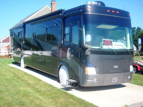 2006 Thor Mandalay 40B Class A Motorhome, 52,000 Miles, 400 Cummins engine, 6 Speed Allison Transmission, Freightliner with independent front suspension, 4 Slides, 4 awnings, sleeps 6, and has leveling jacks. Equipped with furnace, water heater, basement storage, power boost antenna, back up camera with side cameras, power mirrors, fog lights, tow package, smoke detector. Cherry cabinets, Corian counter tops, Central Vac, 3 TV's, AGS System, Washer/Dryer, 8 Kw Onan Generator, 2000 watt inverter, many extras. This has been a No smoking no pet coach. Maintenance records are available. Blue/Silver full body paint, in great condition. Non-smoking unit, no pets, and have service records.