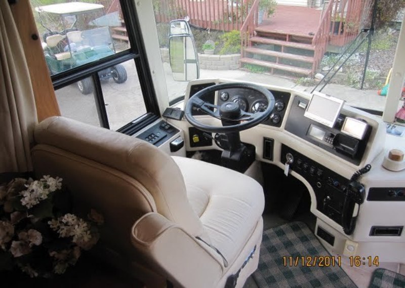 washer/dryer, Quiet Diesel Generator. The inside of this coach has like-new carpet and tile flooring in the kitchen and bath, 2 sleeper sofas (one leather) and dinette with two extra matching chairs, stain glass inserts in cabinet doors, Bose Lifestyle surround sound system, Bose outdoor speakers, 7" color back-up monitor, leather massage cab seats with 6 way power & footrest, maple wood cabinets. |