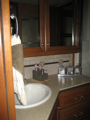 A/C’s ducted throughout the coach. Exterior: Full body paint w/ 3M protective front mask, power patio and door awnings, full window awnings, and sunscreens, electric entry step, keyless entry, 2 pass through compartments with sliding trays, 4 additional storage compartments with one being an outside entertainment center w/ 26” flat screen TV and DirecTV receiver. Color rear camera. Interior: Cockpit consists of 2 Ultra-Leather 6 way electric captains chairs with the copilot seat having powered foot rest. Powered sun visors, tilt/telescoping leather steering wheel with cruise/wipers/lights buttons integrated in. Adjustable gas/brake pedals. Color rear monitor, AM/FM/CD with surround sound system. Living area consists of Ultra-Leather sleeper sofa that converts to a queen bed with pillow top air mattress and a fabric “jack knife” sofa that converts to a double bed. 32” LCD flat screen TV, DVD player, DirecTV receiver, and AM/FM receiver all connected to surround sound. Dining area consists of table with 2 chairs with additional table leaf and 2 more chairs (stored in rear closet). Kitchen has Corian counter tops with matching covers for stove and sink. The stove is a 3 burner cook top with convection/microwave oven. 4-door stainless steel refrigerator/freezer with ice maker. Large pantry and lots of cabinets for storage. Bathroom has a large glass enclosed shower with skylight, solid surface countertop with sink, large mirrored vanity, wall mirror and plenty of cabinets and drawers. The toilet is in a separate room with a small vanity and sink. Bedroom has a queen bed, full rear wall wardrobe closet w/ mirrored doors. The dresser has a solid surface with many drawers. Reading lights on each side of bed and a 20” flat screen TV with DVD and DirecTV receiver. The washer/dryer in located in a cabinet next to the wardrobe and has lots of storage above. |