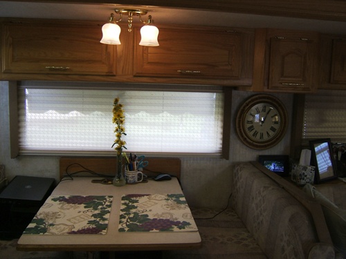 | 2000 Pace Arrow Vision 35 FT long with two large slides on it. Everything works fine on it. It has 31,703 miles on it at this time. It has new laminate wood floors in the kitchen as well as in the bathroom. The owners prior to us replaced the carpet through out. There are auto steps going out the rig. The seats are very comfortable for traveling. There are covers for the front windshield as well as the driver and passenger windows. There is a door on the drivers side. We also installed a 32" TV in front and a 19" with DVD player in the bedroom. A full length closet and 2 other shorter closet. One with shelves for shoes or whatever you'd like to put there. There is a laundry hamper at the foot of the bed as well as more shelves above it. As well as 3 large dresser drawers there, at the head of the bed there is a bedside drawer and a cabinet above that with 3 shelves in it. There is a oven as well as a microwave convection oven above the 3 burner stove top. There is a tv dish on the roof as well as a antenna with booster. Also there is a CB radio all hooked up. Also there is dual air conditioners with heater coils. So the rig can handle the hottest weather or the coldest cold. The windows have day/night shades. Lots of storage underneath the coach as well. Just added two new tires. | ||