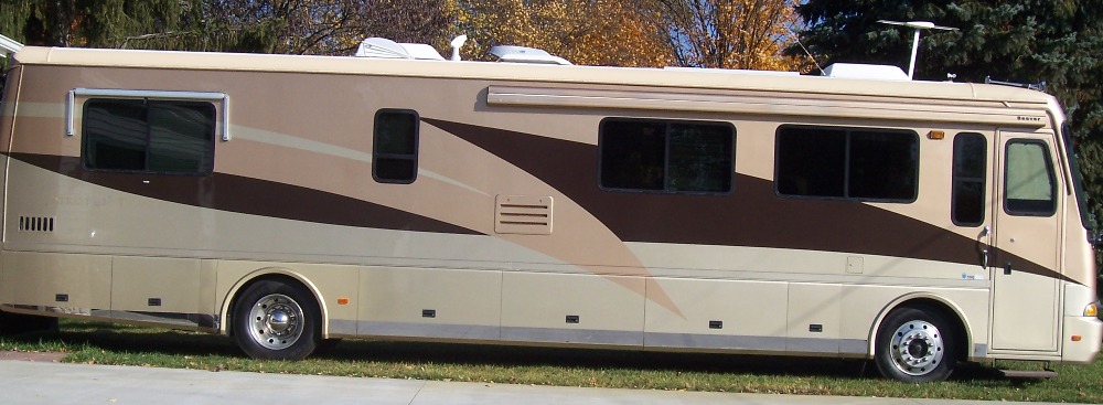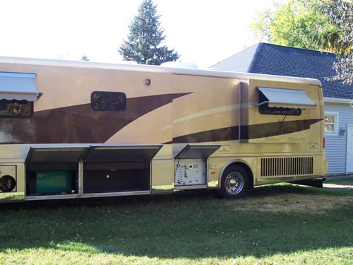 | 2000 Beaver Patriot Thunder. This coach is priced to sell at $ 89,900. 40ft. W/2 slides. 425 HP Caterpillar diesel, Allison 6 speed transmission, Magnum air ride chassis, Pressure Pro tire pressure monitoring system (allows automatic constant checking of all motorhome tires as well as the towed vehicle tires while on the move), Onan 7.5 KW diesel generator with only 370 hours. 2500 watt Heart Freedom inverter, Hydraulic levelers, Backup monitor, Bose Lifestyle CD/AM-FM/Tape/TV unit up front and Bose Wave Radio in bedroom, 3 TV's with satellite system or cable hook up, Gaggenau stove, Microwave/convection oven, Large Norcold 4 door refrigerator/freezer with ice maker, Splendide washer/dryer unit, Diesel hurricane hot water heat and endless domestic hot water system, Corian counter tops throughout, Corian dinning table with leaf and four chairs, Split bath with private toilet and designer shower with skylight, Queen walkaround bed, Day/night shades and blinds throughout, Large cedar lined rear wardrobe, Carefree armored awnings, Gerrard power patio awning with auto wind sensor, Power cord reel, Dual ducted roof ac units, Manifold water system with outside shower. Large cargo storage bays with slide out tray, August 2012 professional maintainence free roof coating applied. May 2012 two new chassis batteries. 2011 6 new Michelin tires premium XZA2 Energy tires and four wheel alignment, 1500 miles on tires. Many more extras too numerous to list here. This coach has never been used full time and has been meticulously maintained with the utmost care. 63,000 very easy miles, Clear title. Absolutely no issues with this coach. Non smoker. Reason for selling: we have done our traveling and have seen the country. We finally found the place we wanted to stay and built a new home. | ||