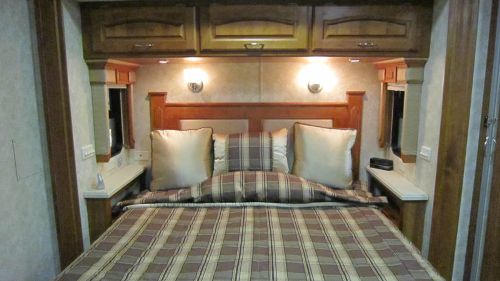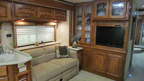 include: * Beautiful Cherry cabinets * Queen leather sofa bed * Home theater surround sound system * 4 power slide outs * 6-way power pilot and co-pilot seat with footrest * Power sunvisors * Solid surface countertops throughout * Ceramic tile in kitchen, bath, and entry * Microwave/convection oven * Side by side refrigerator * Washer /dryer * Blackout shades in living room and bedroom * Automatic front door and patio awnings |