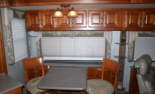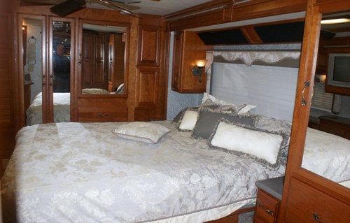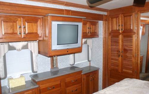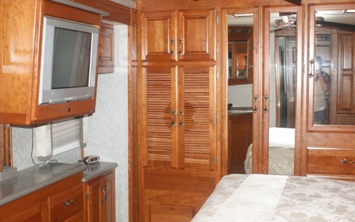 FOR SALE Customized 2005/06 American Tradition 42R. Coach is in excellent condition with low mileage (36,000 miles). This is a special ordered coach (SOC) with several upscale features. Some of the items include: 1. All solid cherry interior with leather furniture. 2. Special matching cherry ceiling treatment and accent lighting throughout. 3. Larger cabinets in the dining area. 4. Drawer type dish washer with water softener. 5. Large Stainless Steel, RV type refrigerator. Unit is a 14 cuft side wise refrigerator, with ice maker and 15 setup to operate on 110volt, 12volt or LPG. 6. Three way, micro wave, convection & halogen speed cook oven. 7. Sunken Kitchen Aid, LPG range with sealed glass top and corian covers. 8. Under counter water filter with convenient drinking water faucet. This unit also filters the water for the icemaker. 9. Computer desk with drawer for printer and space for CPU. lncludes slide out tray for key board or lap top as well as storage for office supplies. 10. Newer 32" LCD HD TV. 11. Double cellular, Pull down blinds in windshield and side window area. lncludes matching corner trim boxes. These blinds help reduce sun load. 12. Accent lighting under cabinets. 13. Dehumidifier with matching cherry cabinet and Corian top. 14. Special shower control and upscale hand held shower head. 15. Fold away matching solid cherry coffee table. 16. Solar screens for windshield and side windows as well as for the skylight in shower. 17. Non skid mats for entrance steps and drivers area. 18. Full length stainless steel exit handle by front door. 19. Strip lighting in entrance step area for accent and safety. 20. Awnings on side windows. 21. Slide out trays in outside bins. 22. High performance on demand, 85 psi water pump. 23. Outside lighting in patio area. 24. Outside entertainment center, ready. 25. Custom, easy to install, vinyl wheel covers and mounting tracks. 26. Polished stainless steel lower body trim. 27. Solar screen for patio awning to reduce sun lad. 28. Patio mat (12'X20') 29. Various spare/ replacement parts, bulbs, fuses and instruction manuals. 30. New oversized Michelin XZA1 steering tires. 1 In addition to these special features, this coach has all of the standard items found in a 42R American Tradition, such as: 1. 400 Hp Cat C9 Diesel with 6 speed Allison Transmission. 2. 10kw diesel generator with auto start & power slide. 3. Automotive style full paint and graphics with clear coat. 4. Tag axle. 5. 4 large slide-out rooms. 6. Liquid tank capacity: Fresh water - 120 gal /grey water - 60 gal / black water - 40 gal / Fuel - 150 gal / LPG —38 gal 7. Three 13.5 m air conditioners 8. Sensa tank level indicators. 9. Automatic TracVision domed digital satellite System. See attached list of all standard items. |