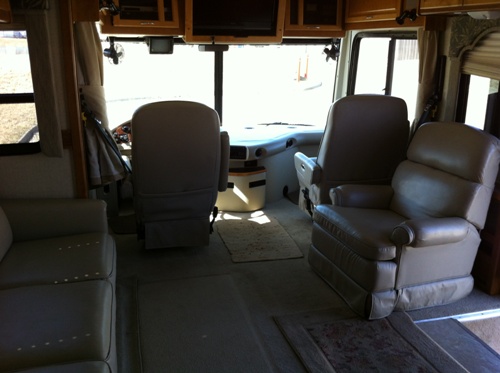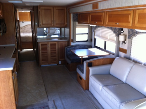 perfectly. INTERIOR FEATURES: Carpet, Ceramic Floors, Oak Cabinets, Corian Counter Tops, Full Kitchen, Deluxe fridge, Microwave, Conv. Microwave, Sleeps: 4-6: Queen Island Bed, Sofa Sleeper, Dinette Sleeper, Flat screens TVs, DVD, CD/Cassette, Sound System, Skylight, Washer/dryer combo, Day/Night Shades, Monitor Panel, Fantastic Fan EXTERIOR FEATURES: Dual Pane Windows, Awnings, Dual air, Generator, Auto leveling, Ducted AC/Heat, Roof AC, Furnace, Exhaust Brake, Electric Step, Back-up Camera (Black & White), Basement Storage, Trailer Hitch, Tow Package. |