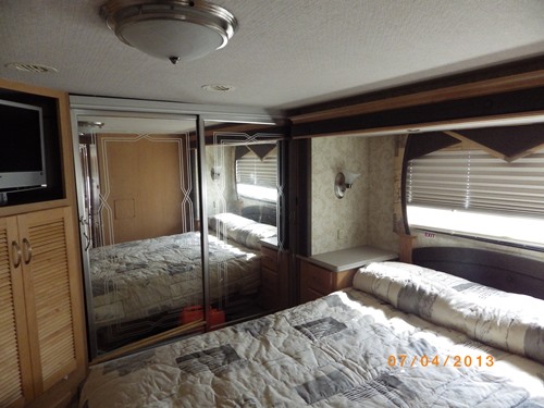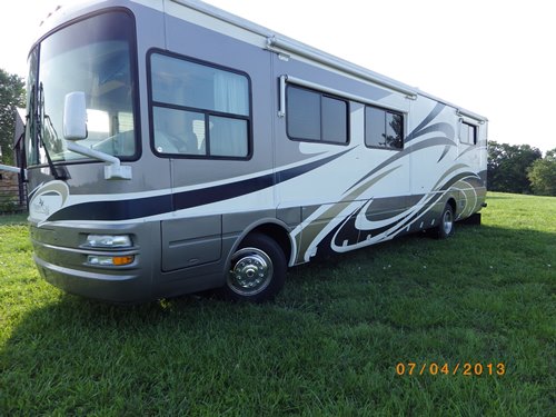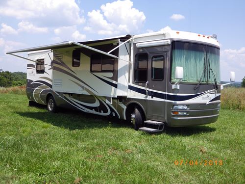 chassis. FEATURES INCLUDE: Maple cabinets, Stainless Steel 12 cubic foot side by side refrigerator w/icemaker, High output three burner cooktop with flush mount Corian range cover, GE Spacemaker convection microwave oven with carousel, built in light and fantastic fan, Day/Night shades, TV, DVD, CD/Cassette, Sound system, and Monitor panel, Plush carpet in bedroom and living area, Ceramic tile flooring elsewhere day/night shades, Bath area has a Corian vanity w/sink, toilet, insulated skylight in shower, medicine cabinet, Bedroom area has Corian Vanity w/sink medicine cabinet, Queen size bed with pull out storage drawers below bed, Rear wardrobe with mirrored sliding doors, Has three electrically controlled slides w/awnings, Full air brakes with ABS, Neway full air suspension with manual air dump, Heating and air Conditioners Two 20,000 BTU furnaces and two 13,500 BTU roof ducted A/Cs, Comfort control Panel and a climate controlled fantastic ceiling fan, Electrical Onan 7.5kw Quiet Diesel generator, 50amp 120 volt distribution panel, 2000 watt inverter / converter, Battery disconnect switches, Lights in exterior compartments, Manual dump valves, Black holding tank rinsing system, Outside shower and three separate pump switches, Outside shower, Generator, Ducted A/C and heat, Roof A/C, Furnace, Back-up camera, HWH leveling, Exhaust brake, Dual pane windows, Awnings, Basement storage, Electric step, Trailer hitch, and Tow package. This is a smoke free unit well-kept and ready to sell, 2005 National Tropical LX-T396 Diesel 39ft Freightliner chassis, 3 slides. |