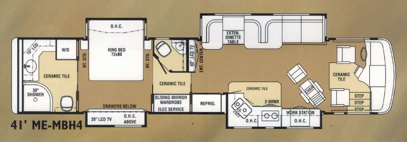 paint shrinkage). The coach is a 42ft Quad Slide Diesel Pusher. Built on a Spartan Chassis, powered by a Cummins 400HP Diesel Engine. It has an Allison 6 Speed Transmission. Equipment includes: Onan 8K Quiet Diesel Generator, Automatic Levelers, Aluminum Wheels, Air Brakes with ABS, Color Back Up Camera w/Audio, Side Cameras, Driver Info Center, Cruise Control, Tilt/Telescoping Wheel, Power Adjustable Pedals, Sony GPS with DVD, CD (with 10 CD holder) radio and Sirius radio, Power Front Visors, Power Leather Cockpit Seats, Power Footrest, Keyless Entry, Full Body Paint, 3M Front Clear Guard, Fiberglass Roof, Exterior Security/Docking Lights, Auto Patio Awning, Slide Out Toppers, 2 2000 Watt Inverters, roof mounted remote control spotlight. Dual Ducted Roof A/C’s w/Heat Pumps, Fantastic Fan w/Rain Sensor, Full Pass Through Basement Storage with Slide Out, 50 Amp Electric Cord w/Power Reel, Power Water Hose Reel, and Hydro Hot Continuous Hot Water/Heat System. Cherry Stained Maple Hardwood Cabinets w/Rollouts, Custom Corian Countertops, Flexsteel Leather Interior Furniture Package, Leather Booth Dinette, Lighted Toe Kicks, and Fabric Valances with Day/Night Shades. Ceramic Tile Flooring in main salon, 7ft Padded Ceilings with mirror and light in main area, Dual Pane Windows, 4-Dr Refrigerator w/Ice Maker. The galley is a gourmet kitchen with a 4-Burner Meile cooktop (propane). It has a Convection/Microwave Oven, deep sinks, pull up counter extender and a Water Purifier which could be converted to an instant hot water dispenser. The coach has Dual Lavatories, a King Bed, Raised Panel Mirror Pocket & Closet Doors, Cedar Lined Wardrobe Closet, Washer & Dryer combination. This is a rear bath model and the shower is tile lined. The toilets are full electric and the rear lavatory has a full size sink. The coach is outfitted with 2 TV’s including 42in LCD Flat Screen & VCR/DVD, JVC Home Theater Surround Sound System, AM/FM/CD Radio, AMP w/Subwoofer, King Sundome Auto Satellite Dish in the main salon. Has a DVD Player in the master bedroom with full hookups for a flatscreen television of your choosing. Since this unit was originally designed as a 2 slide out rear garage RV, by virtue of deleting the rear garage and adding two more slides, it has a trunk for additional storage. By placing the engine in front of the rear wheels, it took away the requirement to have a tag axle as it moved a substantial portion of the weight forward onto the front wheels. There is no porpoising and the coach drives like it's on a railroad track. |