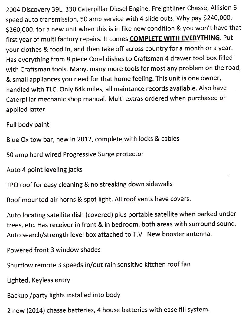 takes you. Chassis / Body features: 4 slide outs, Full Body Paint, 50 amp service, 50 amp hardwired Progressive surge protector, Auto leveling jack system, 10 gallon hot water tank (gas or electric), TPO roof for easy cleaning and no streaking down sidewalls, Roof mounted air horns & spot lights, All roof vents are covered, Roof mounted Auto locate satellite dish (covered), Shurflow remote 3 speed in/out rain sensitive kitchen roof fan, Lighted, keyless entry, Backup / party lights installed into body., 2 new (2014) Chassis batteries, 4 House batteries with EZ fill system, 6 new tires (2010). Protected from sunlight with 303 & tire covers, Spare tire, Manual air supply connector moved to passenger side & put on reel, Power patio and entrance awnings, Auto power entrance steps, All side windows have awnings, Auto reel water hose assembly, Water management area for turning of a valve for fresh water, filling , or using tank water, back flushing of black tank. No multi hoses to , mess with, Heated water & holding tank compartment, Full house water filter, Central Vacuum system, Portable rechargeable vacuum , Combination washer / dryer, Closet with extra shelves, Mud flaps, Full height roof access ladder, 12 cubic foot side by side Dometic refrigerator, 3 burner stove, Microwave, std oven & convection oven in one. Entertainment / Electronic features: Portable satellite dish when parked under trees, Sat receiver in front and in bedroom, Surround sound stereo in front area and bedroom, Auto search / strength level box attached to TV, New booster antenna, Powered front 3 window shades. Convenience extras: Custom, inside applied, front, driver, passenger window and entrance, door sunscreens, Custom dash cover, Craftsmen tool box and tools, Caterpillar mechanic shop manual, Assortment of cleaning chemicals, brushes, handles, microfiber pads, , collapsible buckets, Multi size electric cord reducers, 50 amp ext cord, cheater box, 2 large totes containing various electrical / plumbing / sewer , supplies, Cable cord is on reel, Various supplies; oil, fluids, anti-gel additive, trans fluid, lubes, , etc, Unit leveling blocks, 50 ft three outlet ext cord on reel, Blue Ox tow bar, new 2012, complete with locks and cables. Outside activities: Large BBQ grill, tote full of BBQ utensils, New 9’x19’ outdoor mat, 15” flat screen TV for outdoor picnic area, Collapsible rocking chair, 2 regular chairs, 2 folding beach chairs, 6 ft folding ladder, various outside table coverings, beach towels, beach shoes, various standard and collapsible coolers. Cooking / Dining / Bedding: Corelle dishes, stackable stainless pots, various small kitchen, appliances, various cleaning products, 5 matching throw rugs with throw pillows, various matching dish towels / cloths / pot holders. Full set of matching eating utensils, various cooking utensils, 10 matching sets of towels, 3 sets of matching sheets. |
