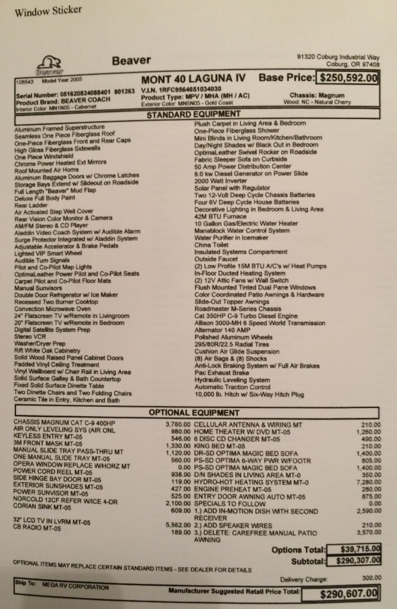 | This is a very nice 40' 4 slide motorhome. It's exterior is MN5N05-Gold Coast and the interior is Cabernet. Besides the list of options on the window sticker pic included in my pictures. The coach was sent back to the factory and an additional air flow intake for the filter was added at the back of the coach and I added a washer dryer combo to the coach when i got. I am the second owner of the coach. I have just had the Hydro-hot system completely gone through and added all new tires. This coach doesn't need anything and is ready to go anywhere. |