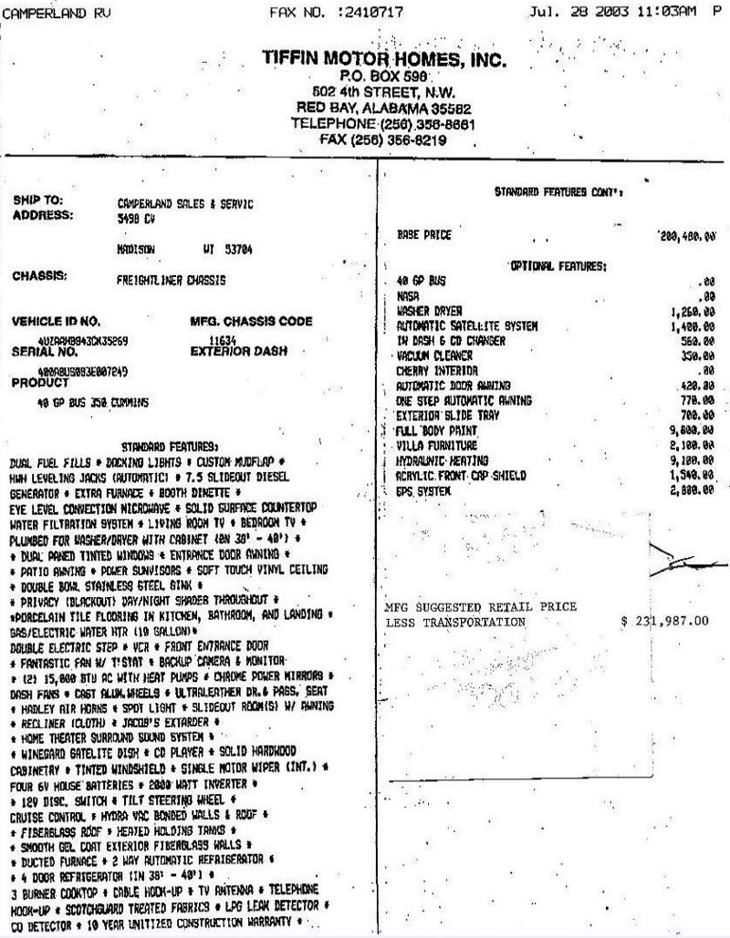 This unit was built for Tim Tiffin. He demonstrated it at the Alabama Football Games and it was featured at the Louisville RV Show for Dealers Only. Tiffin made sure it had the latest technology available at the time of MFG. Camperland Sales in Madison, WI was at the show and they were so impressed they purchased it and brought it to Madison, WI. We were dealing on a four slide 40’ Monaco Coach and were so impressed with the Allegro Bus we purchased it. We traded in a 2000 Isata. The 2003 Allegro was listed at $231,280.00. We were able to purchase the Allegro Bus for $190,000. |