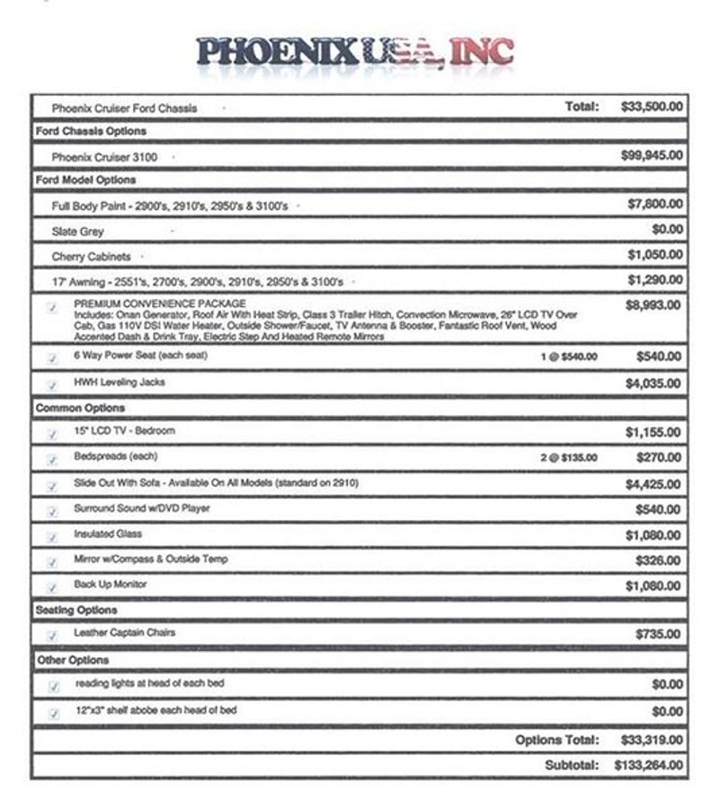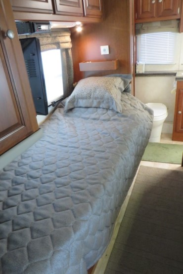 cabinets, dual pane insulated windows. Samsung 26" LCD TV over cab, Samsung five-speaker surround sound system with DVD/CD player, 15" flat screen TV with Boss DVD player (bedroom), 12" x 3' shelves over each bed, TV antenna and booster, Xantrex Pro Inverter, Cummins Onan 4000 Generator, 17' Dometic power awning, Norcold refrigerator/freezer, Atwood LP/CO detector, HalfTime convection/microwave oven, reading lights over beds/dinette/sofa, Fantastic roof fan, Thedford Sani-con macerating waste system, external storage tube for standard sewer hose, Duo Therm roof A/C with heat strip, foldout sofa with electric inflatable mattress, large storage drawers under sofa and dinette seat, twin beds, bedspreads with matching decorator pillows, dual gas/electric hot water heater, optional vanity light with wall switch, holding tank heaters for cold weather, no pets, non-smokers. Luggage rack & ladder, outside shower, electric step, Class 3 trailer hitch. Seven new Michelin tires due to a recall. Tow vehicle available which includes a Blue Ox base plate, tow bar and Brake Buddy braking system |
