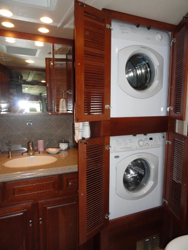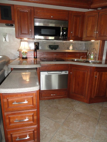 transmission. With the 3 slides extended it is quite spacious and has all of the "bells and whistles": 1 1/2 baths, stacked washer/dryer, Maytag refrigerator/freezer with ice maker, dishwasher, built in Dirt Devil vacuum, a comfy curved sofa and an easy chair with ottoman. A coffee table is added for home like atmosphere. There are 2 interior TVs with surround sound stereo and an outside entertainment center. For cozy chilly evenings there is an electric fireplace. Colors are cream, beige and gray. Technical features include a 10 KW diesel generator and aqua hot water system in addition to others too numerous to mention. We have the Ultimate Extended Warranty with 3 years remaining and is transferable for $50.00. The coach has about 32,000 miles on it. We just wish that we had been able to use it more. |