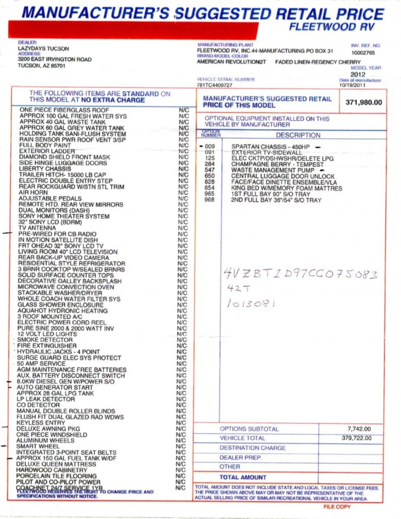 | 2012 American Coach American Revolution 42T w/3 Slides 43FT $230,000 |