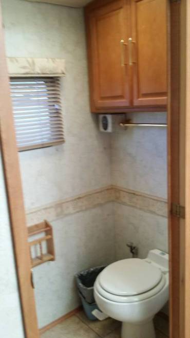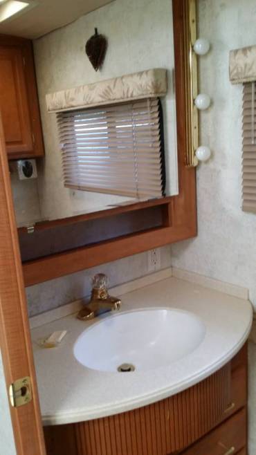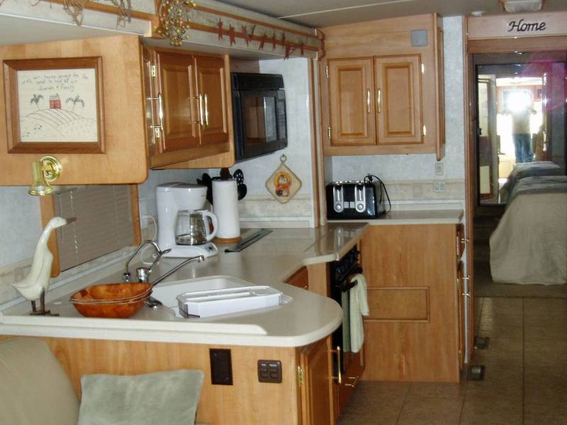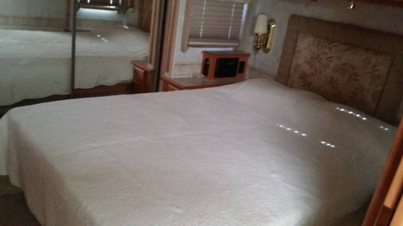 ALL NEW TIRES. This luxurious motorhome is built on a Freightliner chassis and powered by the 350 Cat Diesel & Allison transmission, 40,100 original miles. Triple slide, residential central AC, 40,000 BTU furnace ducted in floor, satellite dish, Onan 7500 watt generator, rear monitor, hydraulic leveling jacks, electric mirrors w/defrost, am/fm stereo w/cassette/cd with remote. Smart wheel steering wheel, trailer hitch- 10,000# draw bar. Two deluxe front leather captains seats with headrest and lumbar support. Inverter/charger 2.0 kw, awnings for patio area, over slide outs and over entrance door. Living area has 2 custom leather sofas, 24 inch flat screen TV, DVD/VCR with remote. Full kitchen with solid surface counter tops, 4 door fridge with ice maker, convection microwave, 3 burner range top, double sink, custom cabinetry and an oak drop leaf table with chairs. Split Bathroom has enclosed toilet, sink with solid surface counter and wall mounted hair dryer in one room, full sized shower with glass door and skylight are opposite the bathroom. Bedroom includes Sleep Number queen size bed, large mirror door closet, 6 drawer dresser w/mirror and 20 inch flat screen TV. Lots of extra storage throughout this motorhome. |