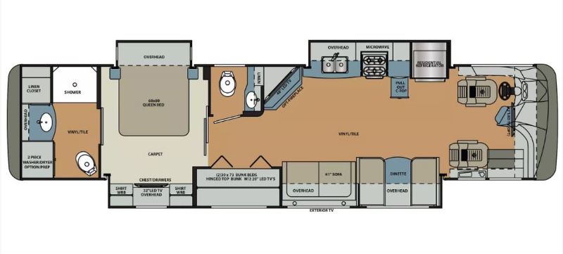 w/ 340 HP, Great power to weight ratio. Allison MH-2500 6-speed automatic transmission, Freigtliner XCR Raised Rail Chassis, 4- 6 volt House Batteries and 2-12 volt starting batteries, 5,000# towing capacity, Full Body Paint exterior,1 piece fiberglass roof, Power awnings,84" interior height,100 Gallon Fuel Tank,6kw diesel generator, 2,000 watt inverter. Full Freightliner, Cummins and Allison warranty's , Very great use of space. Overall length is 39'-6" with sleeping for up to 8 plus the bunk area is super versatile if you don't need to sleep that many. |