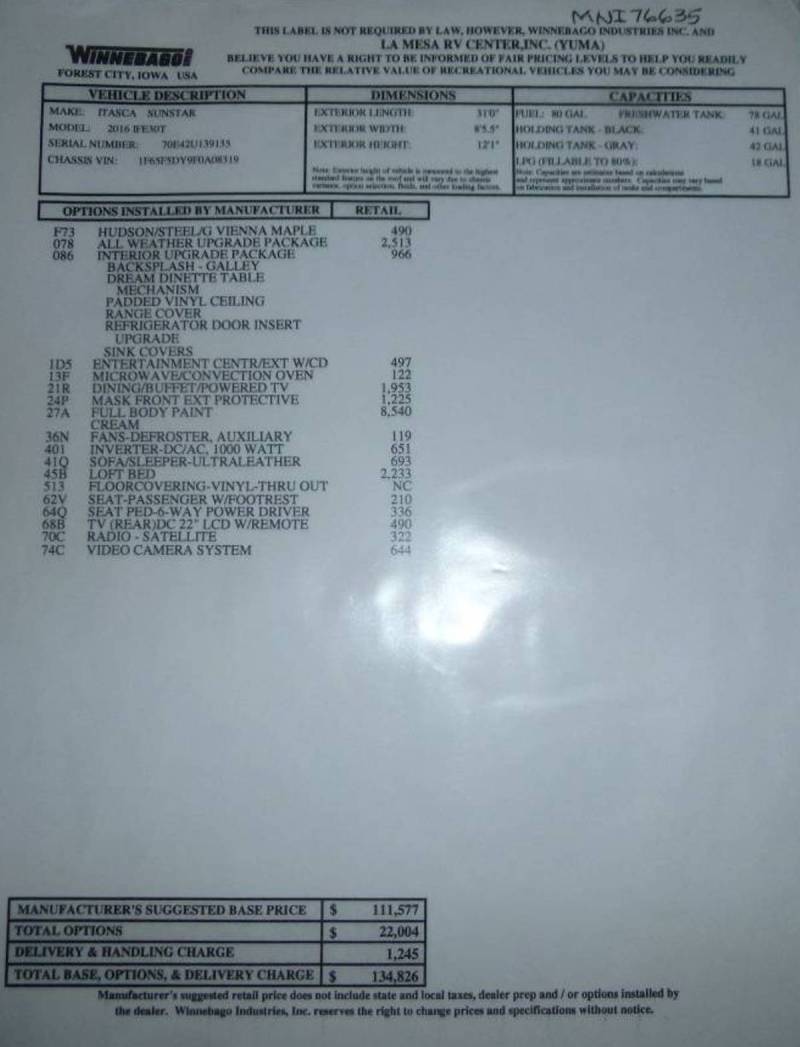 buy our unit. 2016 Winnebago Sunstar 30T Small A with big space! Beautiful colors, Hudson/Steel with Vienna maple. Here is a list of all the features and it has $22,000 in options on this unit: ( see attached list) The exterior is a light cream full paint with $1200, the front exterior mask added for protection against rock chips. UPGRADE PACKAGE INCLUDES 5,500-watt Cummins Onan Marquis Gold gas generator, 2nd high efficiency A/C with heat pumps, (no sweating in the bedroom while camping in the SW) 50-amp. power cord, but you can also select to use only 30 amp and have the adapter, automatic changeover switch for shoreline/generator*** Interior Upgrade Package includes soft vinyl ceiling, galley vinyl tile back-splash ,range cover, two sink covers, raised-panel Norcold refrigerator inserts 2 auxiliary defroster fans,**THREE BURNER RANGE W/ microwave/convection oven, DINING BUFFET W/POWERED TV*****1000 WATT INVERTER***ULTRALEATHER white SOFA re-slanted for relaxation, with air mattress under sofa***VINYL FLOOR COVERING THRU-OUT***PASSENGER Swivel FRONT SEAT W/FOOTREST***6 WAY POWER DRIVER SEAT***REAR LCD TV and DVD player***SATELLITE RADIO***VIDEO CAMERA SYSTEM with 10" dash mounted backup cameras. Custom dash mast to protect from the glare of the white dash. *** There is the $2400 optional electric loft bed. EXTERIOR ENTERTAINMENT CENTER W/CD, and exterior rain vent covers. The following items are standard: Cab seats multi-adjustable slide/recline/swivel*** 3-point seat belts*** Radio/Rearview Monitor System w/color camera, 6" touch screen, handheld remote, and iPod/MP3 input*** Chassis/house battery radio power switch*** Tilt wheel*** Exterior power mirrors w/defrost*** Cruise control*** 12-volt powerpoints*** Map light(s)*** Dash workstation w/USB and 12-volt powerpoint**** Amplified digital TV antenna system*** MCD solar/blackout roller shades*** OnePlace systems monitor*** Powered ventilator fan*** Powered roof vent (bath)*** Tinted windows*** Dual-pane windows*** LED lights*** Corian countertops and drawers with full-extension glides 2-door refrigerator*** Microwave oven***Textured glass shower door***Porcelain toilet***Premium high-gloss sidewall skin*** Automatic entrance door steps*** Automatic hydraulic leveling jacks, Powered patio awning*** Lighted storage compartments*** 110-volt/LP water heater w/motoraid (Auxiliary heat and on the road hot water)*** Heated holding tank compartment*** TrueLevel holding tank monitoring system*** Winterization Package water heater bypass valve and siphon tube*** LPG accessory connection (patio area)*** Holding tank flushing system (black tank only)***LP, smoke, and carbon monoxide detectors*** 10 BC fire extinguisher*** Ground fault interrupter*** Power roof vent***High-mount brake lamp*** This coach is usable with the slides in and out, no folding bed or blocked bathroom. This coach floor plan design allows for easy living and after a day of adventuring the bathroom has ample elbow room and head room with the shower skylight. In the toilet room across the hall, the sink is located to the left, creating counter space for your necessary items. A goodnights sleep is easy on the walk around queen bed, with two large hanging light closets and several drawer for all your travel wardrobe and her shoes. It is outside in our side yard, so if you want extra photos just call or email. Price drop to $99000.00 3 April 2017, willing to look at smaller Class C as part trade. All this on the Ford F53 Chassis, 362 hp, 3-valve Triton V10 engine mated to the 5 speed automatic transmission with tow/haul. You can enjoy life on the road in this 2016 Winnebago Sunstar LX 30T. Thanks you will not be disappointed. |