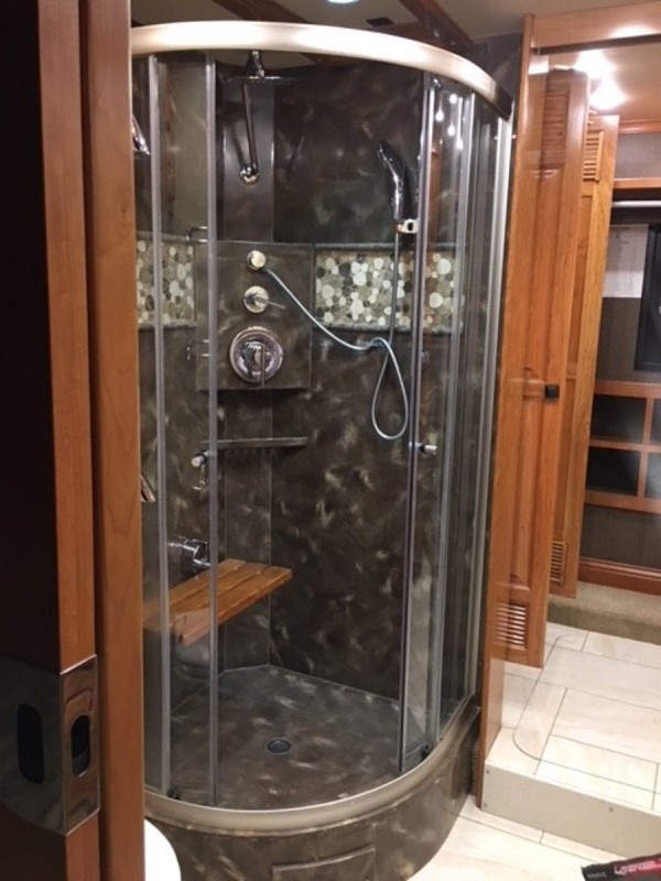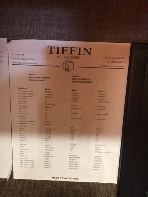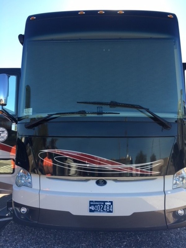 adventures. See list of features below. Exterior: Custom 4 tone paint 4 slides with slide topper awnings Air Leveling Systemk Hydraulic Jack Automatic Leveling System Under slide outside lighting Exterior ground lighting 2 Paramont automatic large awnings Basement refrigerator/freezer 2 manual full tray slides Roof solar panels Roof Direct TV Satellite Dish Front Oman Diesel Generator Outside TV Outside shower hose (never used) 3 roof air conditiioner systems Front door awning Magnum inverter Keyless entry Interior: Mobile Eye Collision Avoidance Residential stainless refrigerator Dishwasher Dual kitchen sinks Corian counters Induction cooktop Convection microwave and oven Queen sleep sofa (bed has never been used) Loveseat with full tray storage underneath Big screen tv Second living room tv above cockpit Electric fireplace Heated off white tile floors Dining table with seating for four Electronic day and night shades Built in computer pull out tray/file drawers King size sleep number mattress Brand new original bedding/pillows Bedroom tv Built in hamper Master bath dual sinks Residential type toilets Two medicine cabinets in master Stacked washer/dryer Master walk-in closet Aqua hot water Power Driver/Passenger seats Central vacuum 3 thermostats Navigation System Kenwood Radio-front dash Surround sound Master closet safe Bedroom ceiling fan Subwoofer in front dash Vertical slide windows Power driver window |