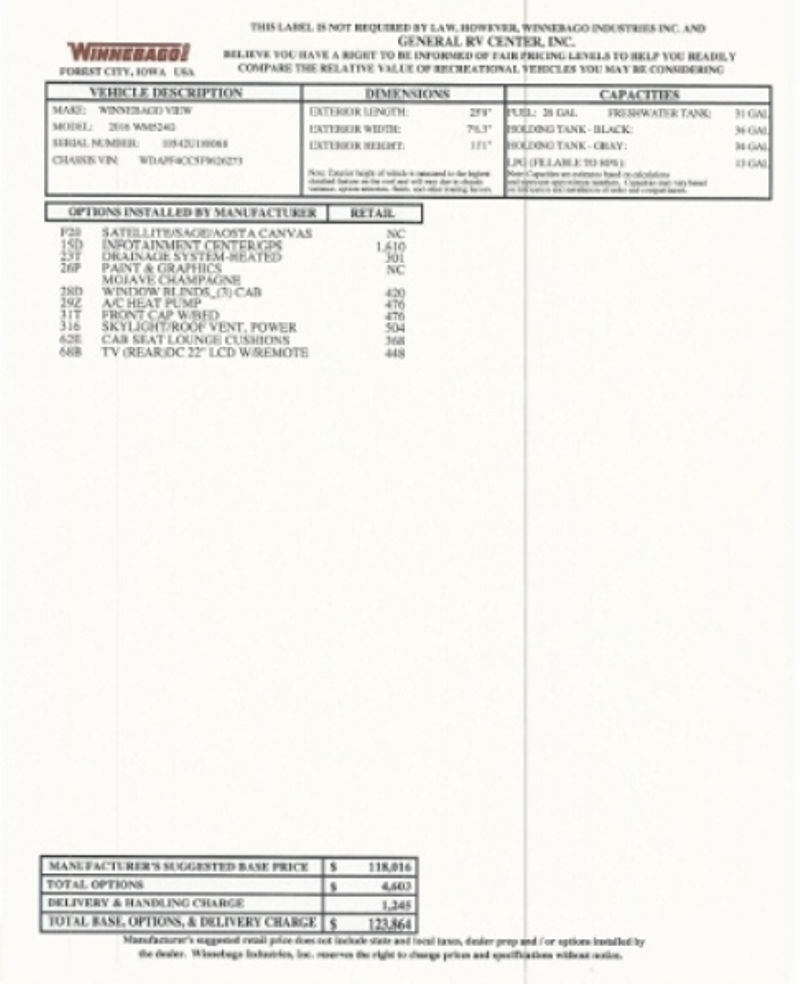 Make Offer 2016 Winnebago View 24 G 3.OL 188 HP Turbo-Diesel is spacious at 25'5" with 2 slide outs yielding a large dinette area and comfortable queen size bed. This RV is in excellent condition. Just had Service Level B done in April 2019. Walk around queen bed, bed over cab plus Flexsteel sofa opens for bed. 2 TVs w/ remotes, (28 " LCD front/ 22" LCD rear), heated drainage system, cab window blinds, A/C heat pump, power skylight roof vent, cab seat lounge cushions, Infotainment Center/Nav GPS, satellite system, radio/rearview color monitor system 6" touch screen handheld remote, ipod/MP3 input, power windows & door locks, 3600 watt Cummins Oman Micro Quiet LP Generator, microwave/ convection oven, two stove top burners w/ glass top, Norcold two door refrigerator freezer, 15,000 BTU Air conditioner, 20,000 BTU furnace, powered patio awning with LED Lights, exterior speakers, 1,000 watt DC/AC Inverter, stereo System AM/FM alarm clock, CD/DVD player, outdoor shower, and 2 aux batteries. Also includes CAMCO Ultra motorhome cover, reflective bubble cut to size for windows, two outdoor folding rocking chairs, Schumacher solar battery charger, hose w/ adjust a brush, camper levelers, Sidewinder sewer hose support and tool kit. Exterior deluxe graphics Mojave Champagne and Satellite/Sage/Aosta Canvas interior decor. This Class C coach will fit in every USA National Park and Canadian Provincial Park camp site. Unit has been well maintained and properly winterized. All manufacture documentation and two sets of keys. |