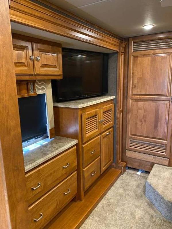 raw silk interior. Upgrades include a 15,000 AC with heat pump, bedroom ceiling fan, cooktop/convection microwave, in-dash navigation, residential fridge, fireplace, Hadley air horns, memory foam king bed, mud flaps, in-motion satellite, stacked washer and dryer, and central vac. |