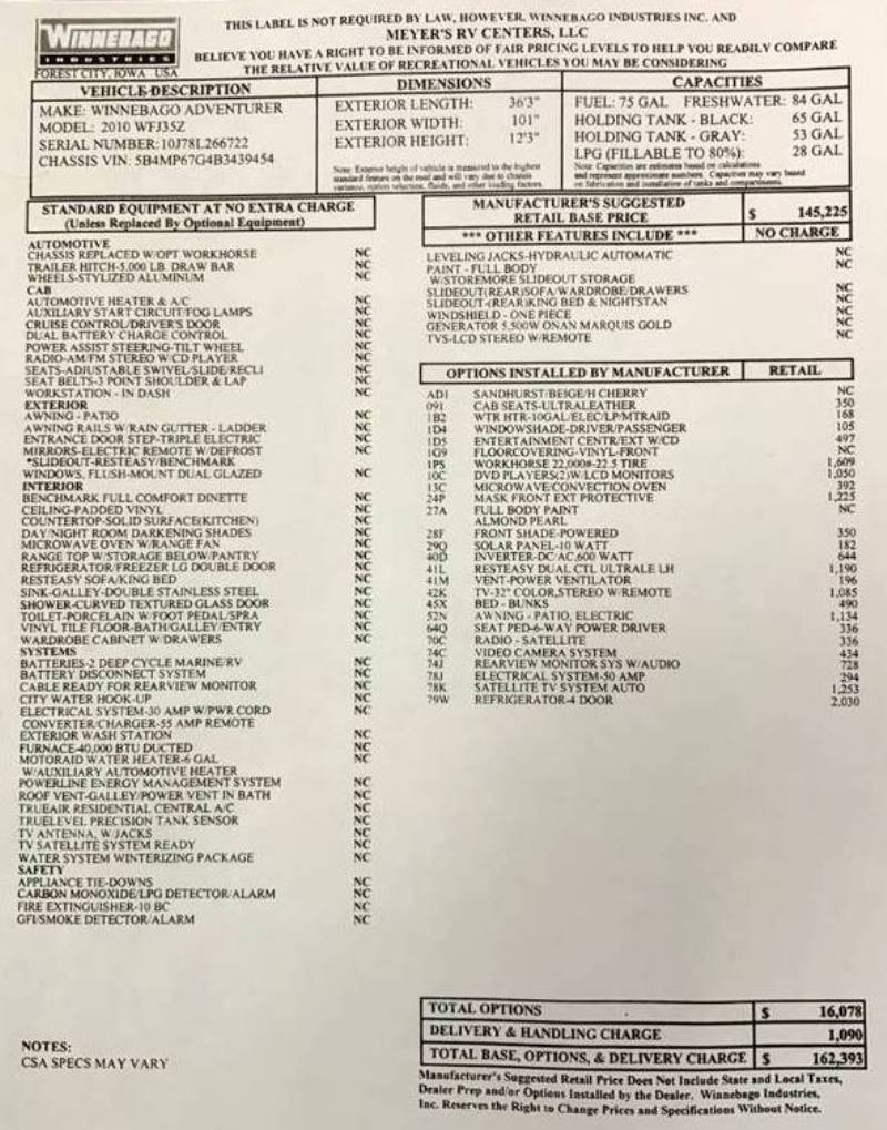 PRICE REDUCED FOR QUICK SALE!!! 2010 Winnebago Adventurer 35Z See attached Manufacturer's Original Invoice for details. |