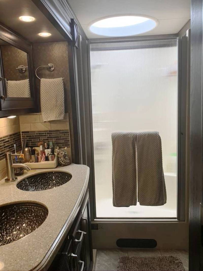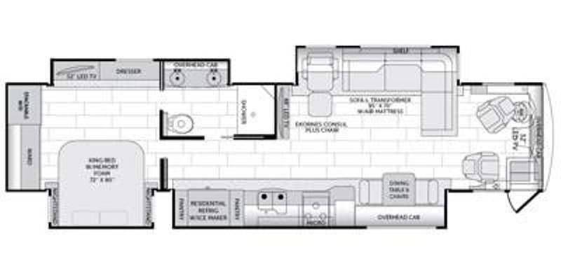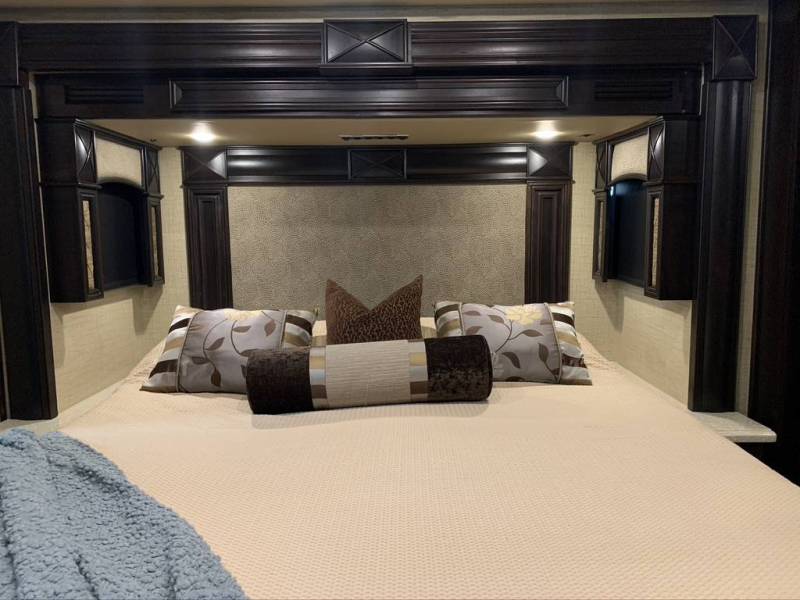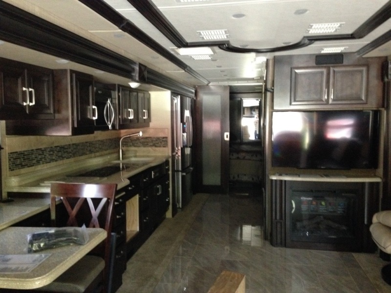 (VIN R5137) Other Features: 100 gal water tank, 60 gal grey, 40 gal black. Holding tank Sani-Flush system, aqua hot hydronic, heated tile floors, individual washer and dryer, fireplace, dishwasher, microwave/convection, 2-burner convection cooktop, residential fridge, in-motion satellite dish, 4 Sony TVs, Sirius XM radio, king bed/mattress. Includes Blue Ox Tow equipment. |
