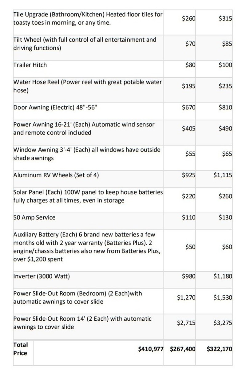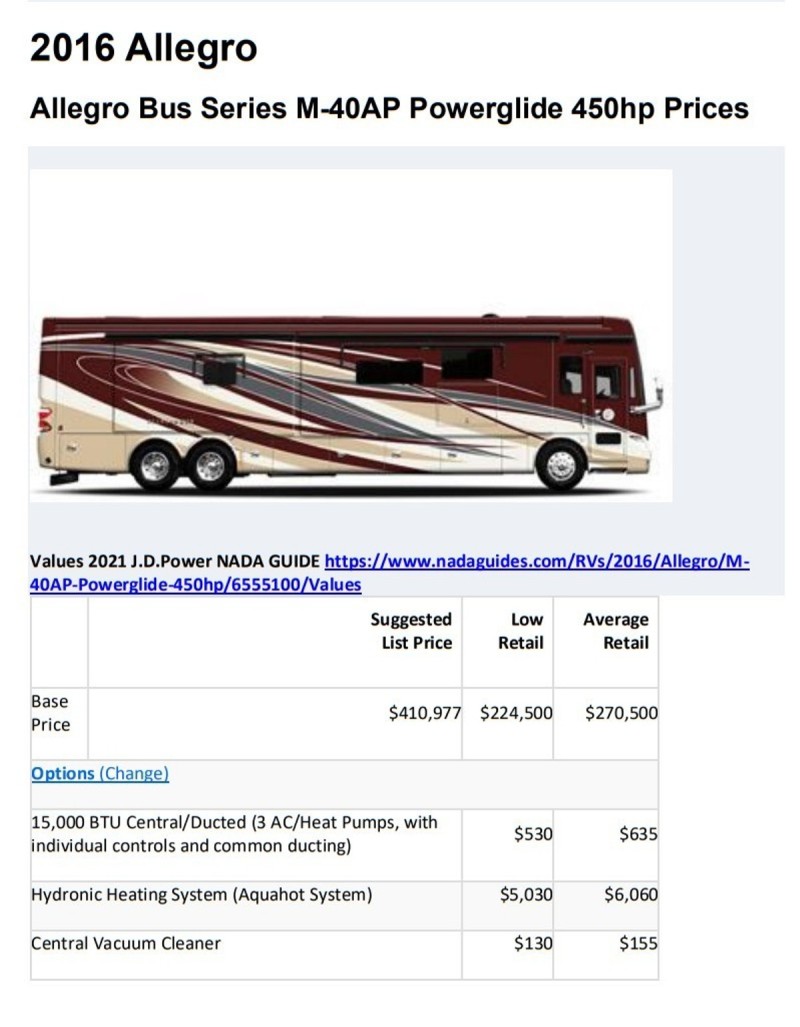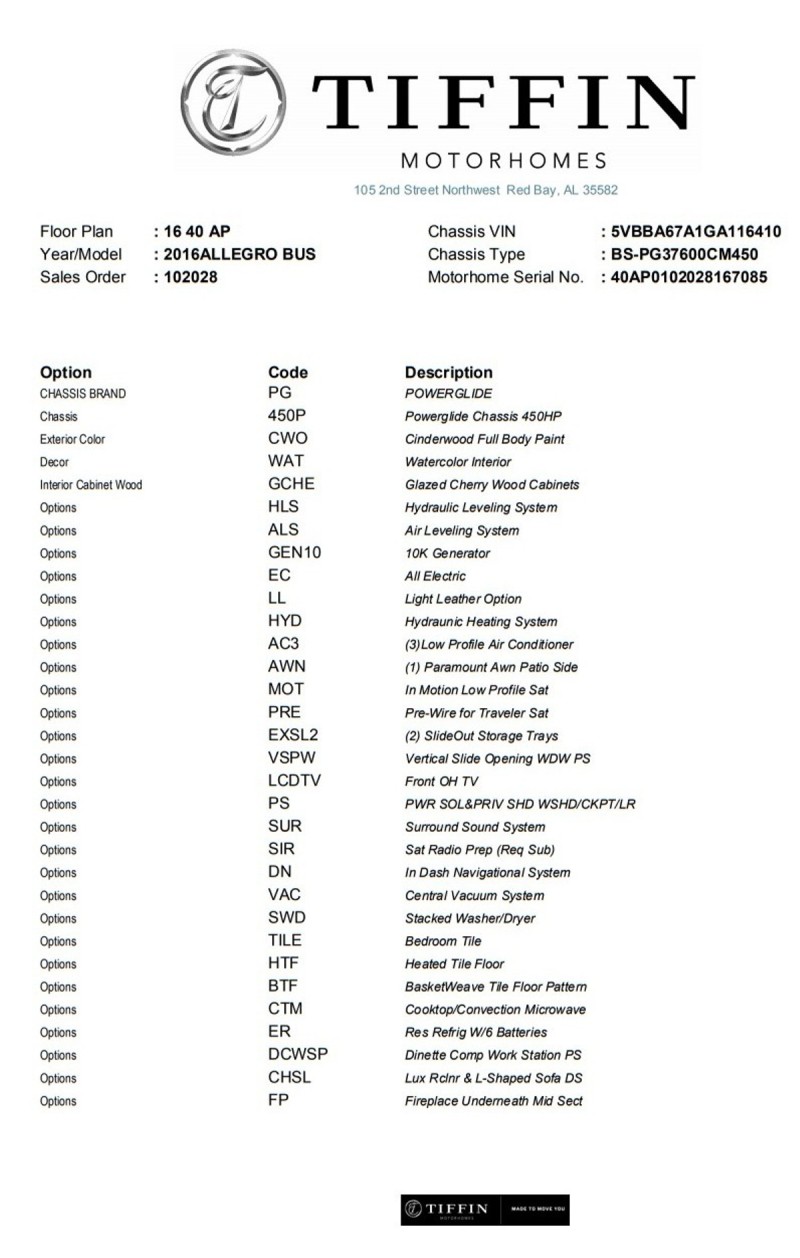 Allegro Bus. 450 HP Rear Engine Diesel Pusher. There are a few of these on Cragislist and RV Trader. Some higher, and some lower, but none offer the extras I am including. Call me or e-mail and I can tell you more and provide more pictures. Shoot, I can even deliver within reason. It's a beauty, with a lot of love and memories attached. This will show you all the standard equipment and specifications. It is the 40AP model. The 3 ducted AC are also Heat Pumps for winter, and it has an Aquahot heating system that keeps the entire coach toasty, even when you are running, which most Coaches do not do without running the generator. When camped, the floor is heated, which Mama loves. And of course a fireplace that produces head and ambiance. 4 flat screen TVs, including one outside. In motion Satellite dish that lets you get satellite even underway, on the road. Anyway, lots to talk about and read about in this beauty. In case you are wondering, we are 74 and 75, and have been RVing for 25 years. So, we've been there and done that, and worked our way up to this beauty, which has been magnificent. But we are not using it as much anymore, and are letting it go to some adventurous souls who will enjoy it like we have. In addition to Tiffin's vast and luxurious standard features, our coach has the following options: FACTORY OPTIONS INSTALLED: • King size Memory Foam Bed • Ultra Leather L shaped Sofa on Drivers side • Two Storage Department Slide out Trays completely through to both sides • Solar Panel on Roof • Air or Hydraulic Auto Level • Stacked Washer and Dryer • Heated Tile Floor (Dual Zone) • 10Kw Diesel Generator • Residential Refrigerator • Fireplace below living room TV • Central Vacuum System • Navigation System in dash • Rear and Side Motor cameras MY INCLUDED EXTRAS AND ACCESSORIES • 6 New House Batteries ($900 retail) • 2 New Chassis Batteries ($250 retail) • Roadmaster Sterling Towbar with baseplate 8K lbs ($1,000 + retail) • Roadmaster Guardian Rock Guard for tow vehicle ($450 retail) • Roadmaster BrakeMaster Air Braking System, for any tow vehicle ($550 retail) • Roof Mounted 100 Watt Solar Panel w/controller system for batteries ($250 retail) • Custom entry carpet in driver/passenger area ($250) • Custom Wheel Well tire covers, snap on ($300) • Year: 2016 • Make: Tiffin Motorhomes • Model: ALLEGRO BUS 40AP • Class: Class A Luxury • Location: Cameron Park, CA • Mileage: 49,334 • Fuel Type: DIESEL • Gross Vehicle Weight: 38,600 • Engine Type: Cummins ISL9. 8.9L. 450 HP. 1250 LB/FT torque. 6 Speed Allison Transmission • Air Conditioners: 3 combination AC/Heat Pumps Ducted throughout with individual area controls • Other Heating: Aquahot hydraunic heating system provides continuous hot water, and circulates heat to the entire coach. • Slide Outs: 4. With awning covers on slide out structure, and window awnings on all windows • Length:41’ • Leveling Jacks: Hydraulic and Air Automatic Levelling • "New DISH Wally receiver that gives you High Definition TV anywhere you go, including while you are on the go with the built in Winegard IN MOTION Satellite Antenna.” • “ Includes transferable 6 Year Extended Warranty from Dealer (La Mesa) good thru 9/01/23, End to End, with Tire Damage and Roadside Tech Support ($7,462 paid at purchase 9/1/17)” |