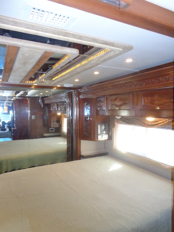 | Top of the line luxury Coach: Detroit 60 series Diesel, 500 HP Engine, known as the million mile engine, only 79,000 miles. New Tires, New Lifeline Batteries, New front window screans and attractive wheel covers, New Clothes washer, seperate Dryer, New winegard Traveler Fully Automatic Sat, both Dish and Direct TV Capabilities available, bedroom coach monitoring with camera, King bed, storage under bed, Aqua hot water heating for both coach and water, plus roof air heat pumps, dishwasher, all electric blinds, double sinks, pull out table that can seat 4-5 people easy, 2 burner gas cook top range, electric flush porcelain toilet, 12500 KW diesel generator low hours, microwave convection oven, tub shower combo, large closet with lots of storage, real wood doors, Ralph Laurin 9 way leather power driver-passenger seats along with twin leather sofas 'two slide out trays in basement, with 4 very large storage areas, built in separate GPS/ coach monitoring units/ Sat in radio. Fiberglass painted roof. Auto leveling feature. Decorative lighted ceilings. Drives like a dream, won't find a nicer clean coach anywhere. Ready to go now. Located at Towerpoint Resort Mesa. |