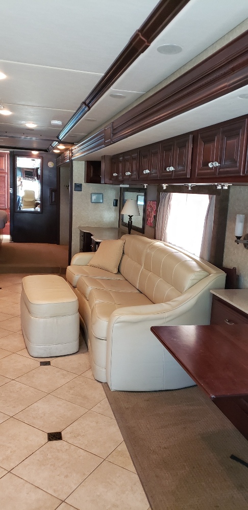 Low miles - 46,400! RARE BATH & A HALF model with FULL-SIZED DESK ideal for working from wherever with the comforts of home! FULL WALL SLIDE creates huge interior space. KING-SIZED, DUAL CONTROL SLEEP NUMBER BED plus sleeper sofa. WASHER/DRYER. 3 TV's inside with two surround sound systems, plus outside TV. Lots of custom upgrades: • New drapes & sheers in living & dining rooms • New wallpaper in both bathrooms • Full-sized leather storage ottoman • Leather foot rest for captain’s chair • Custom dining & desk chairs • Custom built-in cabinetry: • slide out tall kitchen trash • slide out spice rack/mini-pantry • large divided silverware drawer • Full-coach electrical system surge protector • Blue Ox tow bar • Blue Ox Patriot Brake • Towing lights Factory options included: • Dometic Side by Side Stainless Steel Refrigerator • Oven & Convection Microwave • Central Vacuum Cleaner • 10 Gallon Gas/Elec. Water Heater (replaced in 2018) • Electric macerating toilet with half flush option • Exhaust Brake • 8 KW Diesel Generator (894 hours) • Hydraulic Leveling System (Automatic) • Driver and Passenger Heated Power Seats • CB Radio • Cruise Control • Electric Step (recently serviced) • Power Cord Reel • Rear and Side Vision Camera/Monitor • Dome skylight over shower • Full Pass-Through Slide Out Trays for easy access to cargo storage Recent service includes: 6 new tires, all new batteries, new inverter, engine & generator service by Cummins, new air filter and more! All service records available. |