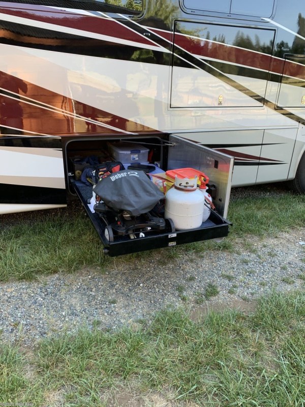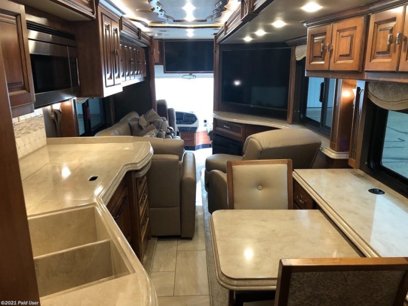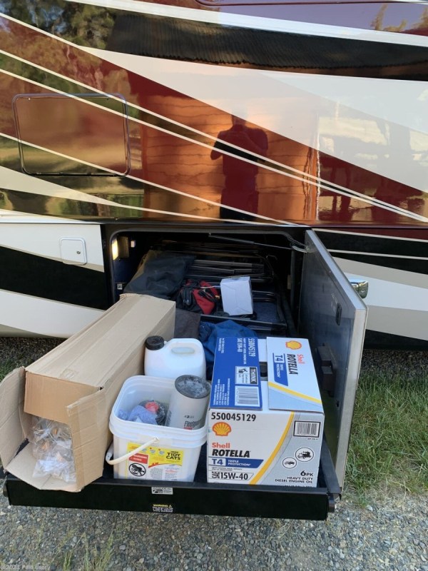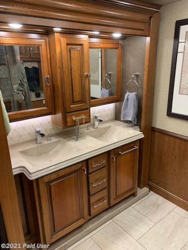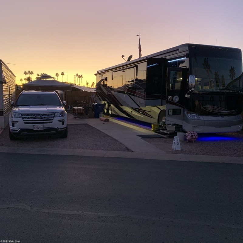 performed records. The floor plan features a L shape sofa with inter graded sofa sleeper, stand-alone recliner, dinette seating for four, and a Sleep Number King bed, heated tile floors, 3 AC units with heat pumps, Aqua hot heating, and electrical surge protection. This bath and a half model has twin sinks in main bathroom, spacious walk-in shower, and a large walk-in closet with washer & dryer. The coach features 6-6 volt batteries, one 140 watt solar panel, Onan 10KW generator (182 hours) two power rollout basement trays, dual patio side awnings, basement Dometic refrigerator/freezer, and lots of storage. We've added a Winegard DISH satellite, Magne Shade window and tire covers. We are still enjoying our coach our belongings are seen throughout listing photos and those items are not included, obviously. Addition information and photos available upon request. Our coach was recently serviced including LOF, transmission, and air filter. |
