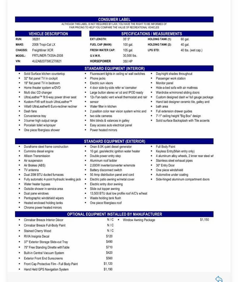 | 2008 Tropi-Cal LX RV, 35.5’, 49,000 miles, 350 HP Cummins 6.7 Diesel engine, Allison 3000 transmission, 3 slide outs, low mileage tires, well maintained, covered storage always. See copy of original specifications, standard and optional equipment enclosed. NADA estimate $106 k. |