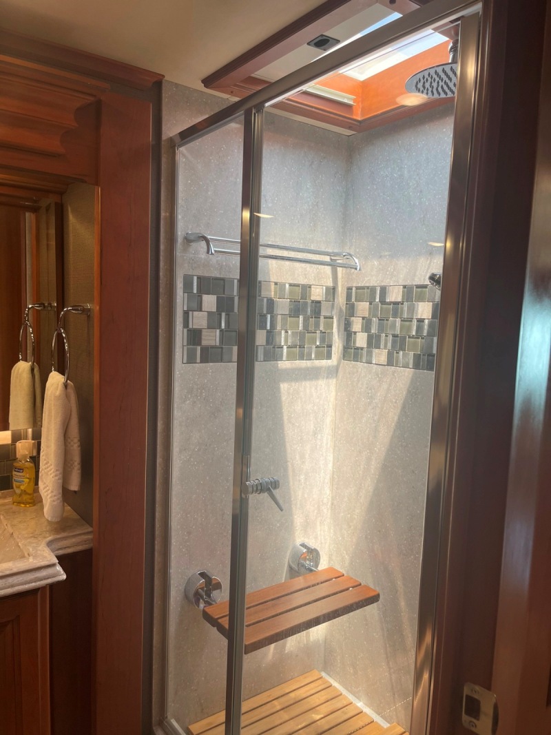 inside. Glazed Cherrywood Cabinets Cinderwood Full Body Paint 2018 Power Glide Chassis 450 HP Bukhara Interior Awning Patio Side Broadway Basket Weave Tile Lux Recliner and L-shaped Sofa DS Dinette Comp Work Stations PS Dishwasher Exterior Grounds Effects Lights 2 Slide-out Storage Trays Heated Tile Floor Exterior Roof Ladder Extended Cycle Batteries In Motion Low Profile Sat Solid Non-Opening WDW PS Power Smart Mattress King 1 Solar Panel Stacked Washer/Dryer Silkworm Ultra Leather Traditional Ceiling Winegard Connect STD TPS Tire Monitor All Recalls Done New DEF sensor installed LED Headlights, Dock Lights Upgrade Front Entrance Floor mats Always Stored Inside. |