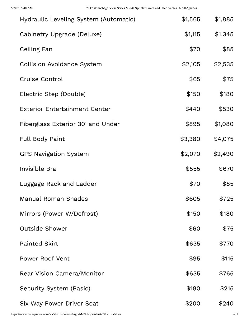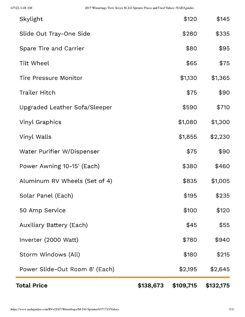 This RV has all the bells and whistles. * Upgraded to double pain windows * Auto Leveling Jacks added * DirecTV Dish with auto dish pointing by Winegard * Added external Propane quick disconnect for grilling * 2 external TV mounts with brackets * A wood fire pellet grill has been securely mounted to a swing out hitch * Gas hunting grill is also being left behind with quick disconnect to above mentioned propane external feed We are leaving many accessories in the cargo bins, so that this RV is ready to rock and roll the first time you drive it. Based on NadaGuides.com, low retail price is $109,715 and high is $132,175. Suggested Retail is $138,673. See the PDF of the NadaGuides pricing. This RV won't last at this price with all the features. The first 1,000 miles were made when the RV was delivered to Colorado from Winnebago. The RV never left Colorado. With the Mercedes-Benz engine, the first oil change isn't even due until 15K miles. All recalls are up to date, so nothing to worry about in keeping the vehicle current. |