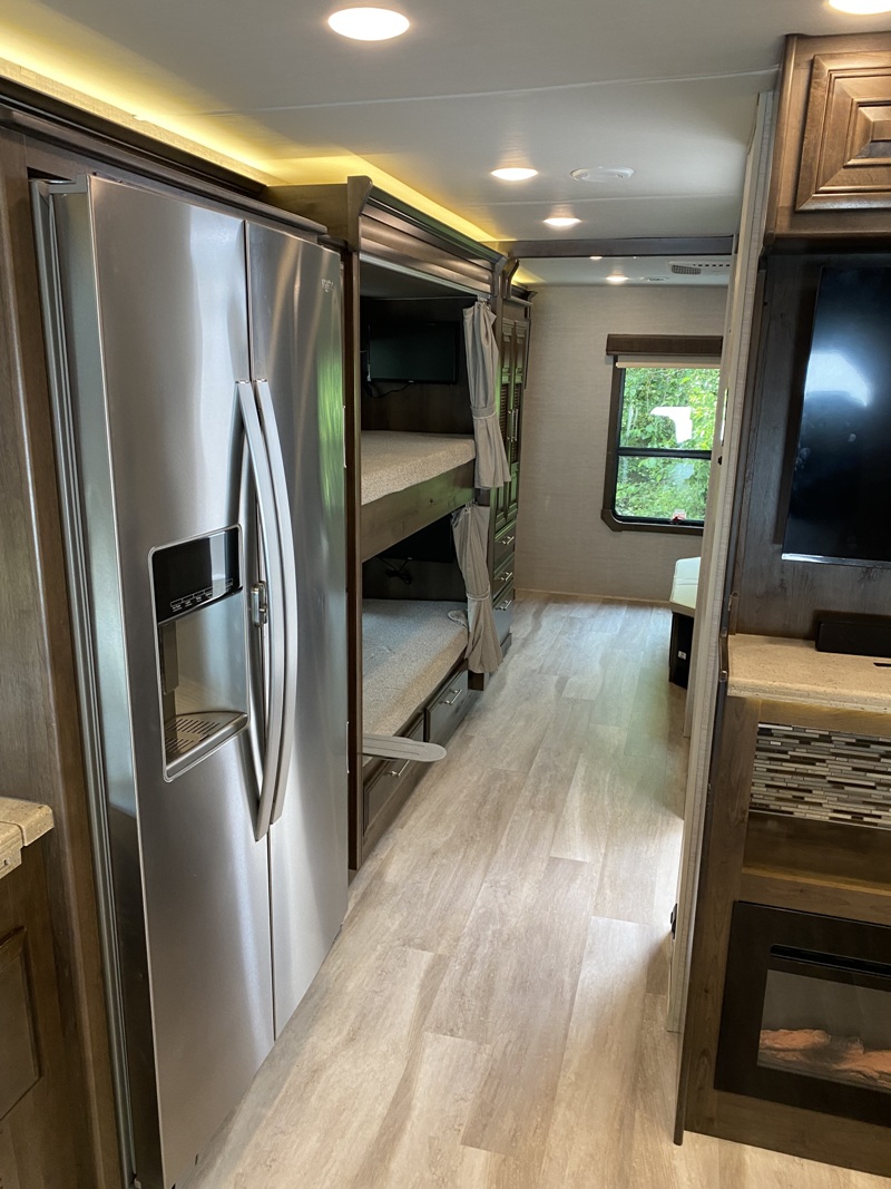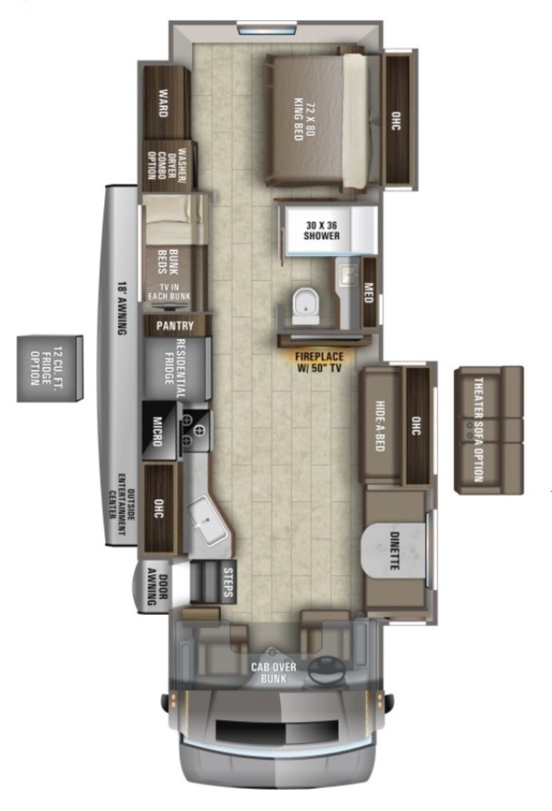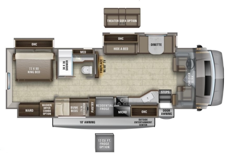 Chassis Freightliner® S2RV chassis Engine Cummins® ISB 6.7L 360 HP diesel engine with 800 ft.-lb. torque Transmission Allison® 3000 MH automatic transmission Alternator 185-amp alternator Tires G-rated highway tires- 275/80R22.5 with Alcoa® aluminum rims Hitch 12,000-lb. hitch with 1,200-lb. tongue capacity and 7-pin plug Chassis Battery Dual 12V chassis batteries Fuel Tank 100-gal. fuel tank DEF Tank 10-gal. DEF tank Leveling System Automatic hydraulic leveling jacks E-Z Drive E-Z Drive™ Premier: Computer-balanced driveshaft, rear air suspension, heavy-duty rear stabilizer bar, full air brakes, SACHS shocks Braking System Engine exhaust brake |