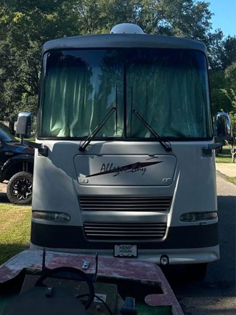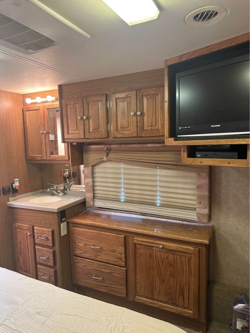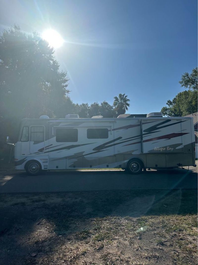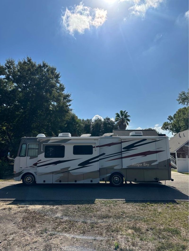 This 35-foot beauty is customized with kid, leather from the Captain’s chairs to the living and dining room area. Digital flat screens replaced all original analog TV’s in the front, the bedroom, and the outside. The large slide in the living room area, along with the custom-made beveled mirror, gives the living and dining room area an expansive feel. We’ve taken excellent care of this vehicle all along to keep it modernized and updated. The entire bedroom slides out and has a queen sized bed with a large, mirrored closet and a big shoe area. There’s a lot of cabinet and storage space both inside and out. Take a look around first. This 2005 Allegro Bay is like none other that might be available. The coach is equipped with a Chevy workhorse chassis and an Onan generator and would be a perfect situation for a first time RV owner. |