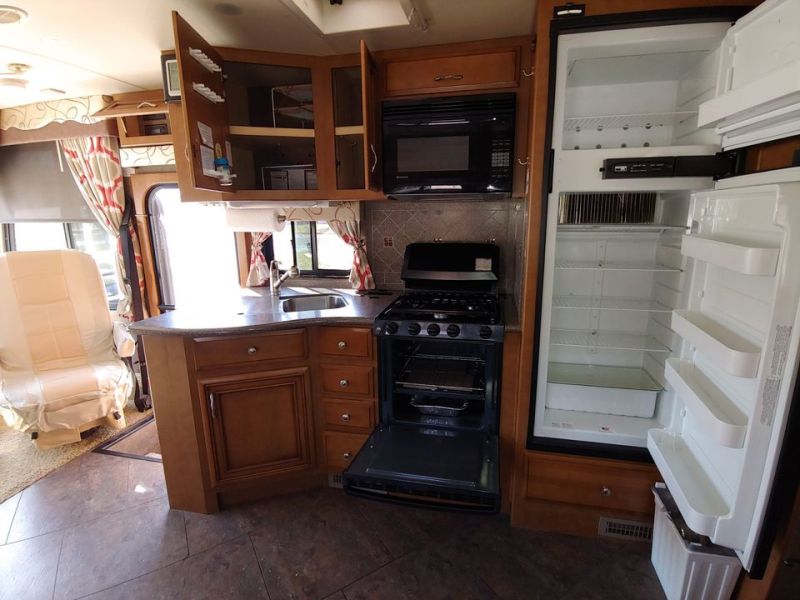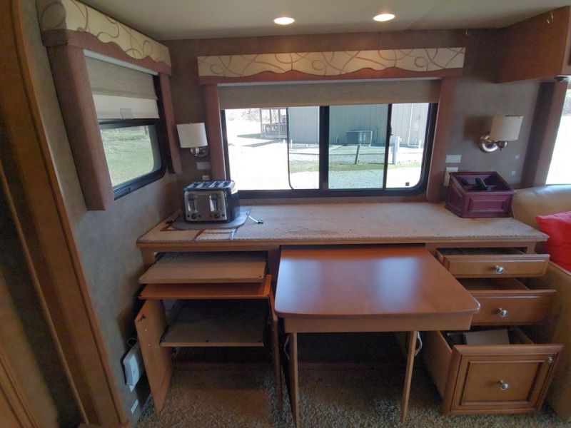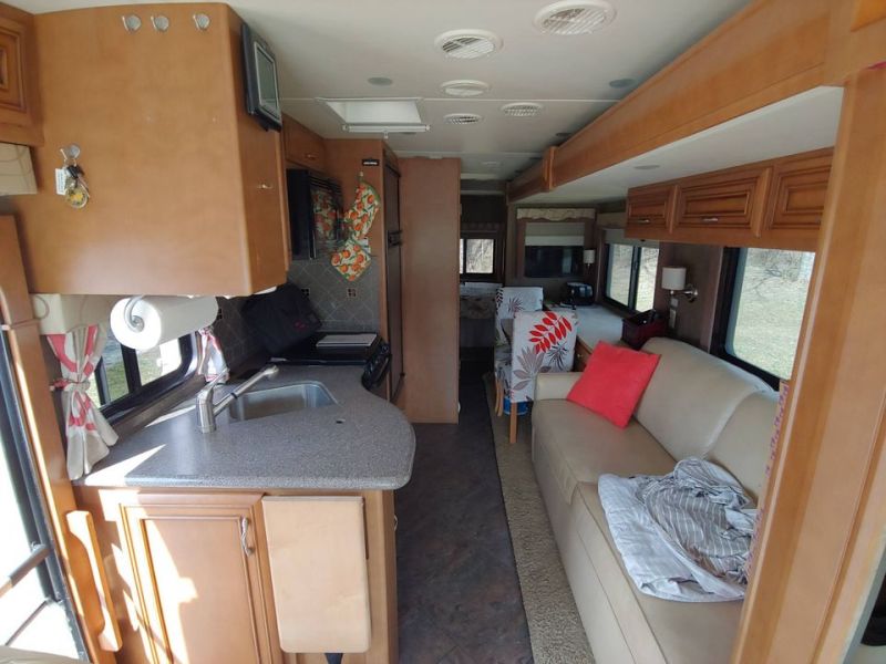Professionally appraised for $109,000. Full use living/kitchen/bathroom/bed with slides in!! Mileage: LOW 30,875 LENGTH:29' 10" (to fit state parks) NEW: 3 batteries; fuel system flush/filters; full tune-up with 8 new sparkplugs; full mechanical check including belts; full suspension check. Dynashield removed and front buffed to shine. Receipts available. 2 queen beds--bedroom + sofa sleeper; Custom cabinetry in bedroom; Complete bathroom with full wall shower/bidet; Desk upgrade with pullout table for 5; 3 Sony TVs including a computer monitor; Upgraded Sony Theater surround sound w/woofer; Upgraded ceiling to floor pantry; Custom designed privacy/blackout shades throughout; 3 Custom electric cab sun shades with custom blackout drapery!! 2 custom exterior window awnings; Upgraded rear camera with sound. And more… 50 AMP Upgrade for Dual AC/Heat units!! Added suspension for heavy weight; Added exterior/interior electrical; 2 added Maxi air vent covers; Powerful inverter for drydocking; strong gas generator; Upgraded 12 pt Power driver’s seat—both swivel; 3 ft deep superslides in living area and bedroom; Wheel covers; added tire pressure extensions. Ford V-10 Triton Horsepower 6.8L 362; Auto power jack leveling; added macerating septic system; Custom made rear opening window. LOTS OF STORAGE! Huge basement storage includes passthroughs. Accessories available. Good exterior condition with a high shine. Needs new cab flooring. Contact Seller for more photos and information. |