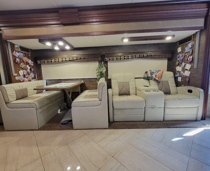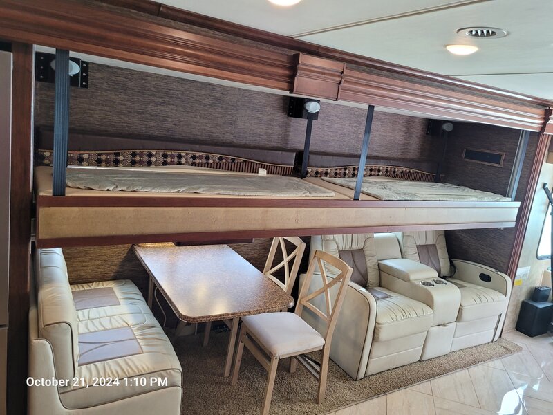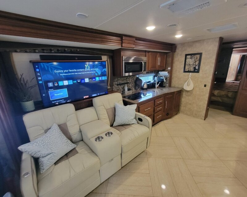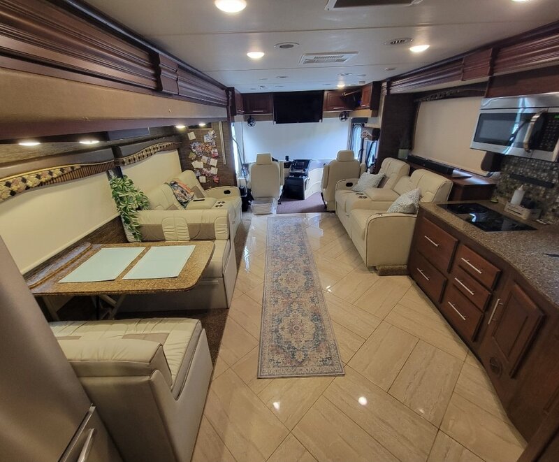 | 2016 Coachmen Sportscoach Cross Country 404RB Beautifully maintained with lots of upgrades. 41 ft, 4 slides makes a spacious interior, sleeps 6. Freightliner chassis with 32,500 mi., Cummins 6.7 ISB, Tires replaced 2 years ago have 15k miles on them. a brand new spare. 4 suspension airbags have been repl. Bath and a half, bedroom w/king bed residential refrigerator that will run indefinitely off of the batteries due to the added solar and upgraded 3500 with peak 4200 inverter/charger . The two 350 watt solar panels and Victron controller will run the entire coach except the A/C and stacked W/D. Generator is a Onan RV 8000 with only 460 hrs. The House batteries replaced 8 mo. ago along with Inverter upgrade. Captains chairs are new along with the recliners and dinette less than a year old. also folding chairs to swap out as shown in pics. Brand new Washer. Residential refrigerator replaced 2022 - 4 tvs, 1 outside, 1 smart on televator in LR. Just came back from a 5300 mile x-country trip. |
