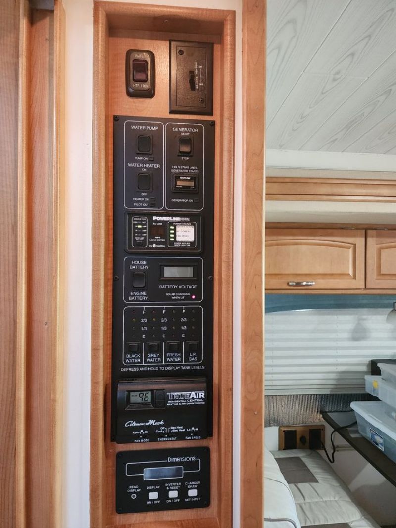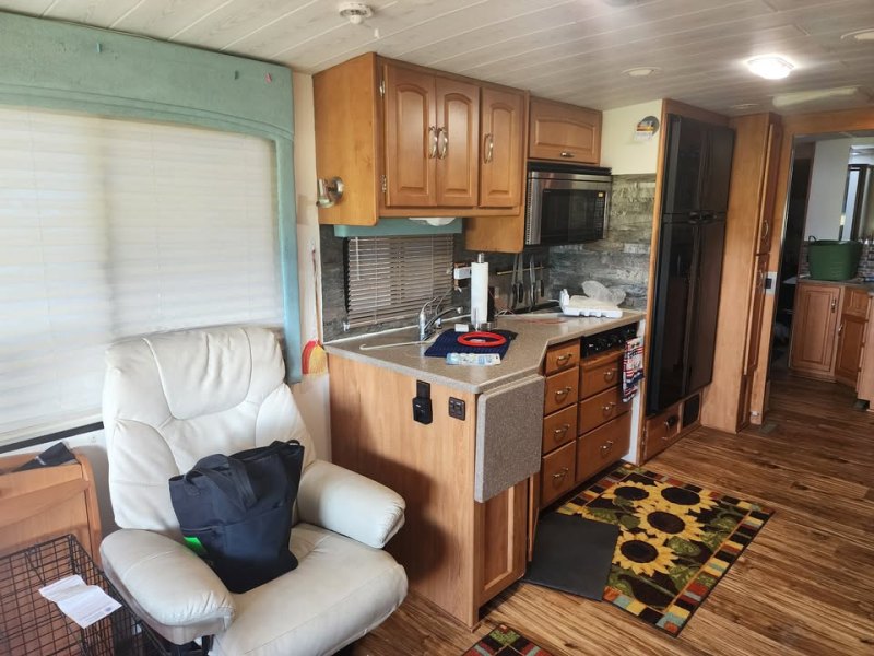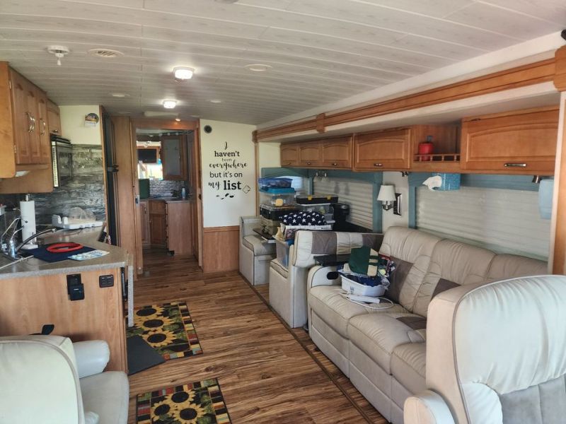 | Diesel pusher, 82215 miles. Remodeled interior, luxury vinyl, foam plank ceiling, painted walls with re-done valances, new couch with recliners on each end and storage in center, new captains chairs, new dinette with storage benches, new recliner, mattress used one season. My husband got sick and ultimately passed away, so no longer needed. Very clean unit inside and out, well loved. Set up to tow a vehicle. We towed a 2017 Chevy Colorado 4x4 and never realized it was back there even going up the mountains. |